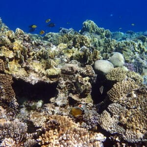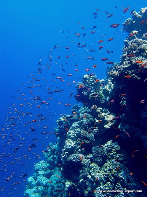 Exploring the Blue Hole consists of snorkeling along the vertical coral walls bordering the sinkhole (snorkeling area 1 on the map), where large shoals of surgeonfish, couples of butterflyfish and small groups of Red Sea bannerfish find shelter.