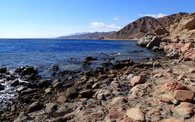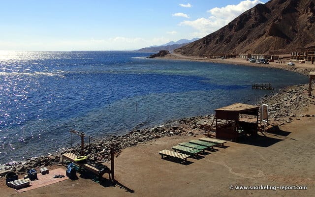 You can get into the water from three entries. The two first entry points (water entrance 1 and 2 on the map above) are straight into the Blue Hole, a few yards from the shore. They are easily located by observing the other snorkelers and divers entering or exiting the water.