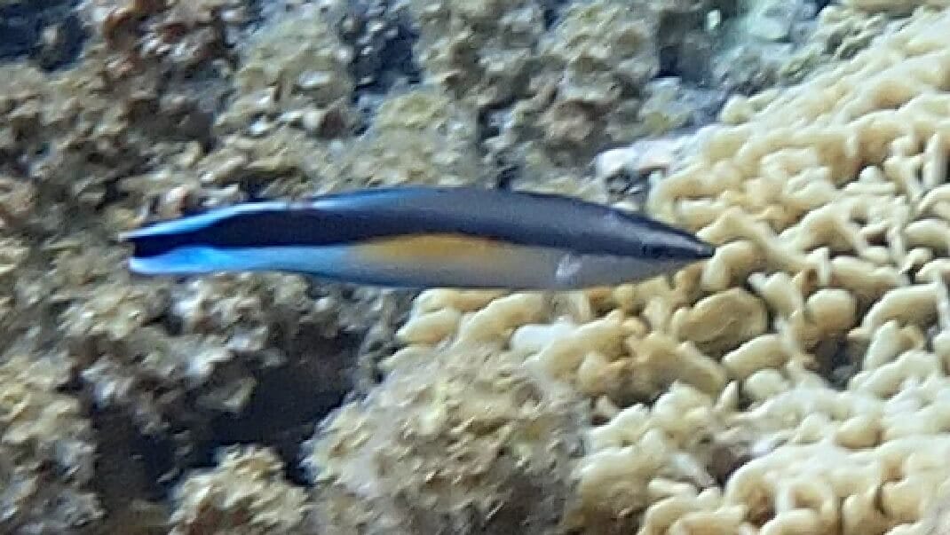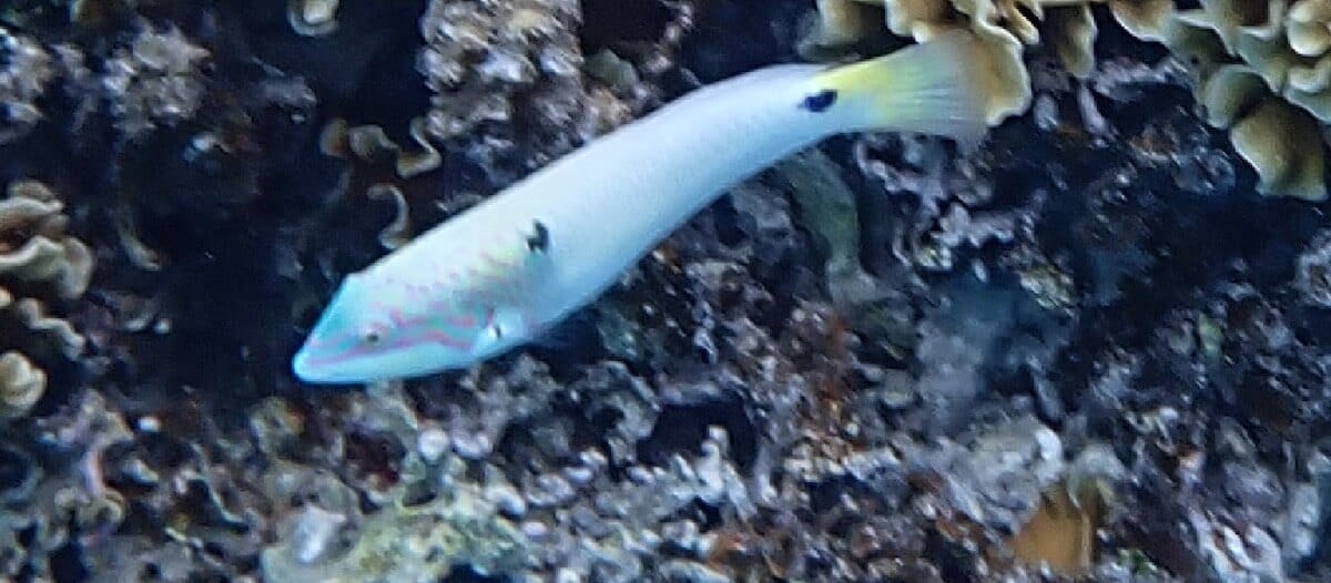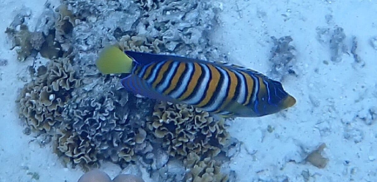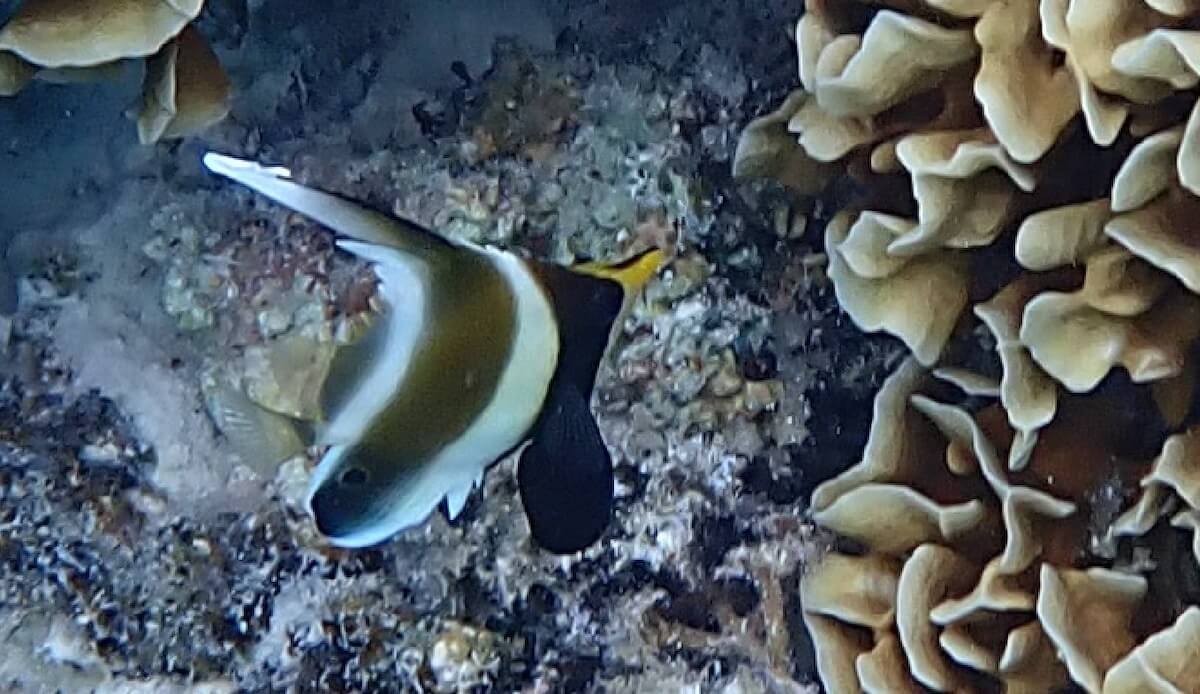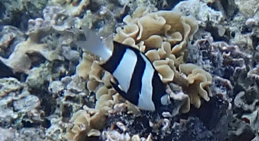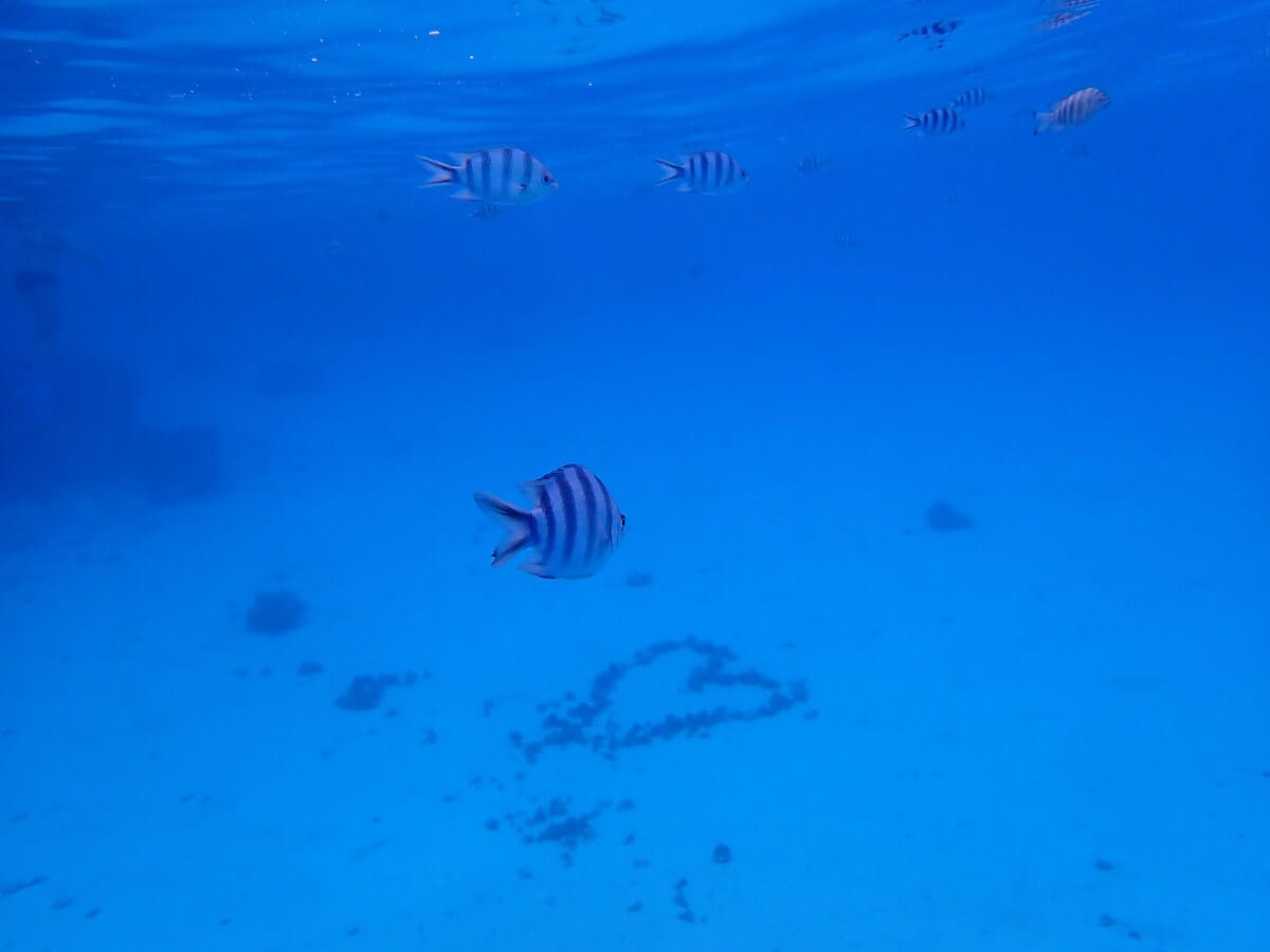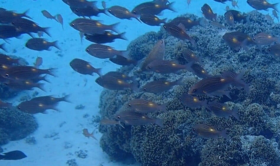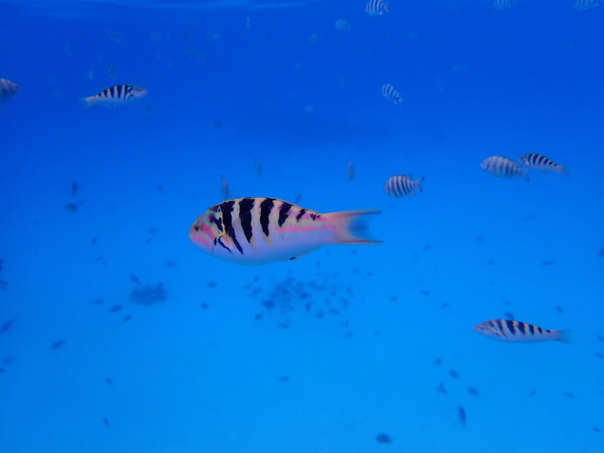 As soon as you enter the water, you will be surrounded by schools of different species of sergeant majors (see species list at the bottom of the page) sheltering near the boats. The thousands of fish suspended in the crystal clear water create a magical atmosphere.