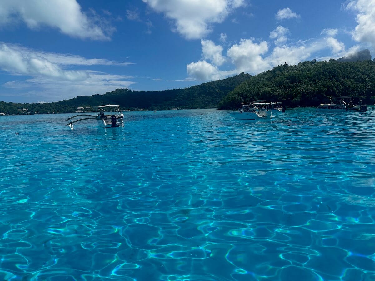In the sandy area that stretches between the boats and the reef, you can spot the “I Love Bora Bora” sign written with stones. This is the opportunity for a beautiful souvenir photo!