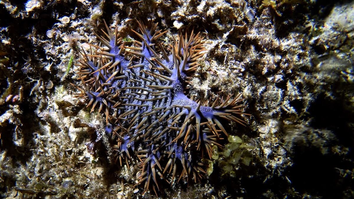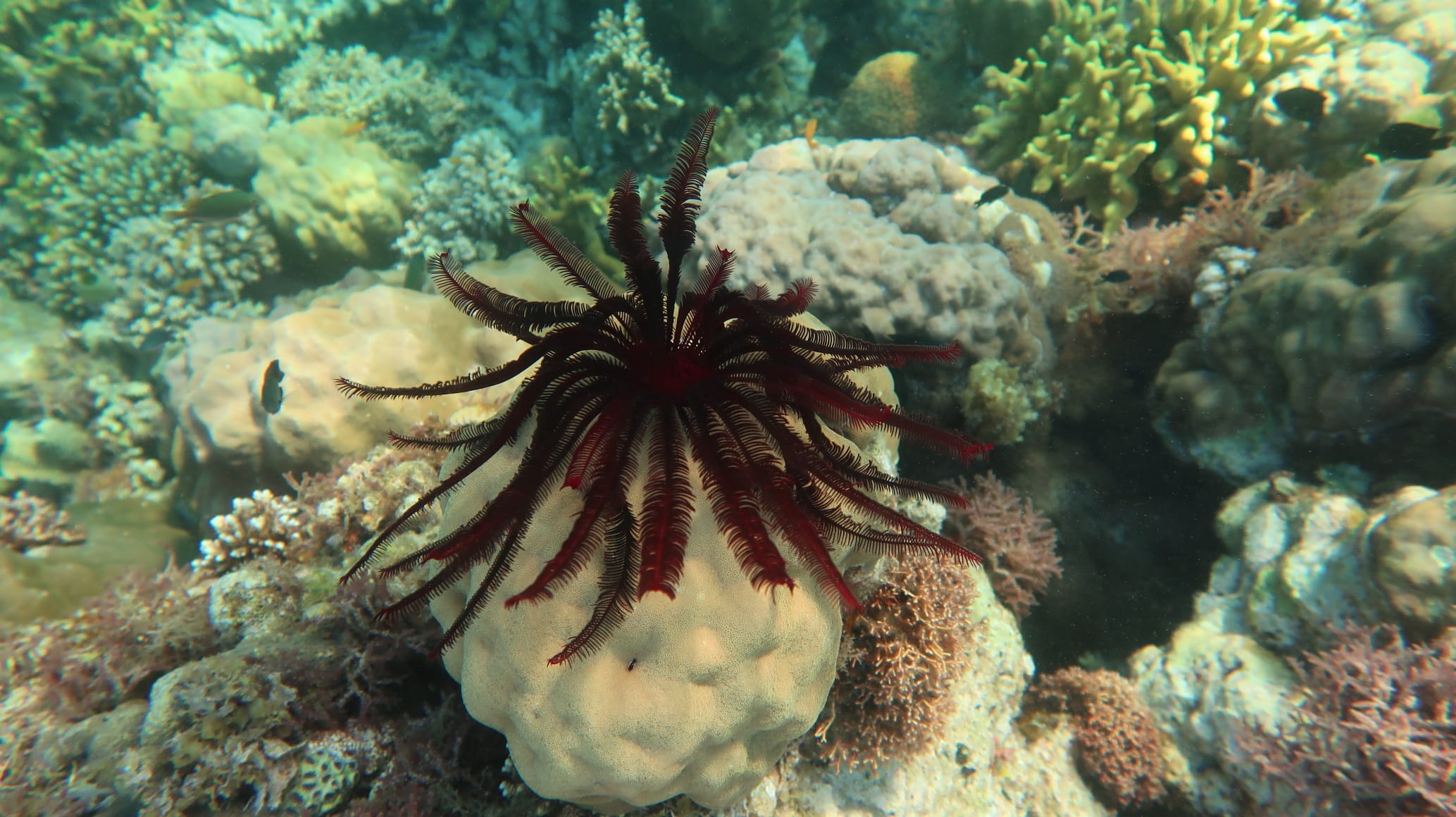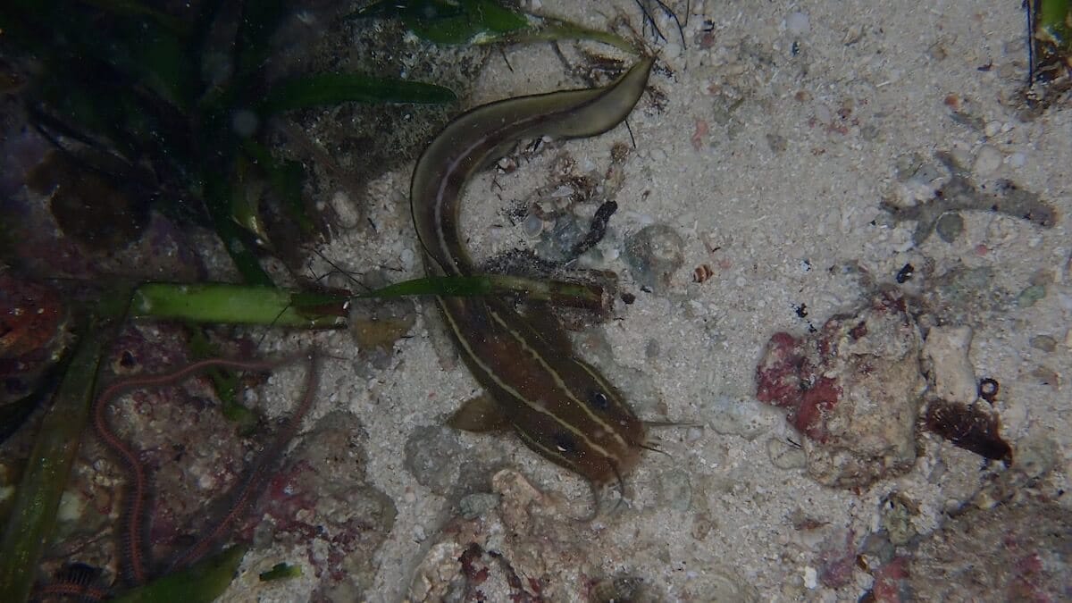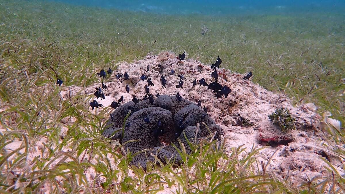 Starting from the beach, you will first snorkel above a shallow reef flat ↕2-6ft. This reef flat is mainly made of sandy and grassy beds, interspersed with some coral bommies. On the reef flat are living sea stars from different species, sea urchins, blennies, small moray eels and sharpnose puffer.