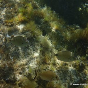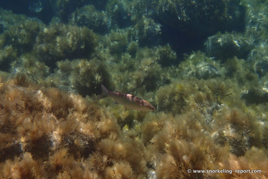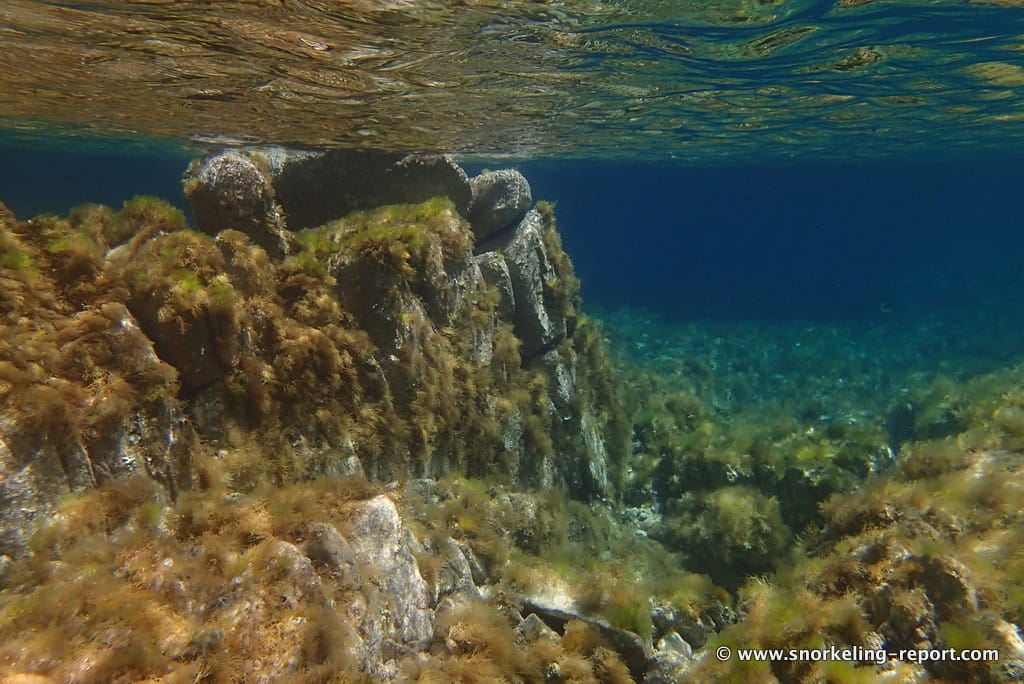 Underwater life especially thrives on the rocky areas rimming the small bays (↕0,5-2m/2-6ft). The rocks are covered with seaweed that shelters many fish species such as blennies, rainbow wrasse, ornate wrasse and brown wrasse.