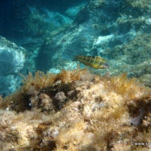 While swimming along the rocky drop-offs, you will see an interesting variety of species thriving between the water surface and 2-3 meters beneath: painted combers, groups of damselfish staying still above granite rocks… Try to spot tiny red-black triplefin hiding in cracks and crevices. Common and ornate wrasse like this place, you will find them where currents created by the waves hitting the rocks are stronger.