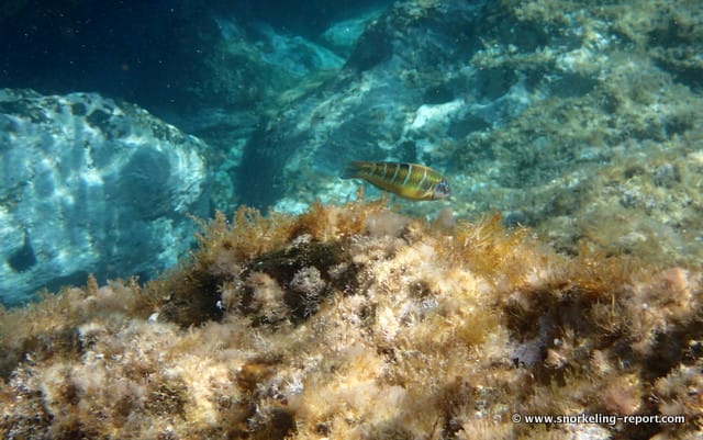 Snorkeling here is most interesting along the rocky outcrops bordering the creek on both sides of the beach. The cliff standing out on your right when facing the sea is probably the best area for spotting fish. Water depth is too important in the central part of the Calanque (↕10 m) to be interesting for snorkelers.