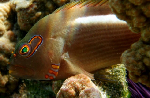 Moray eels are fairly common here, as are pufferfish, Moorish Idols and butterflyfish.