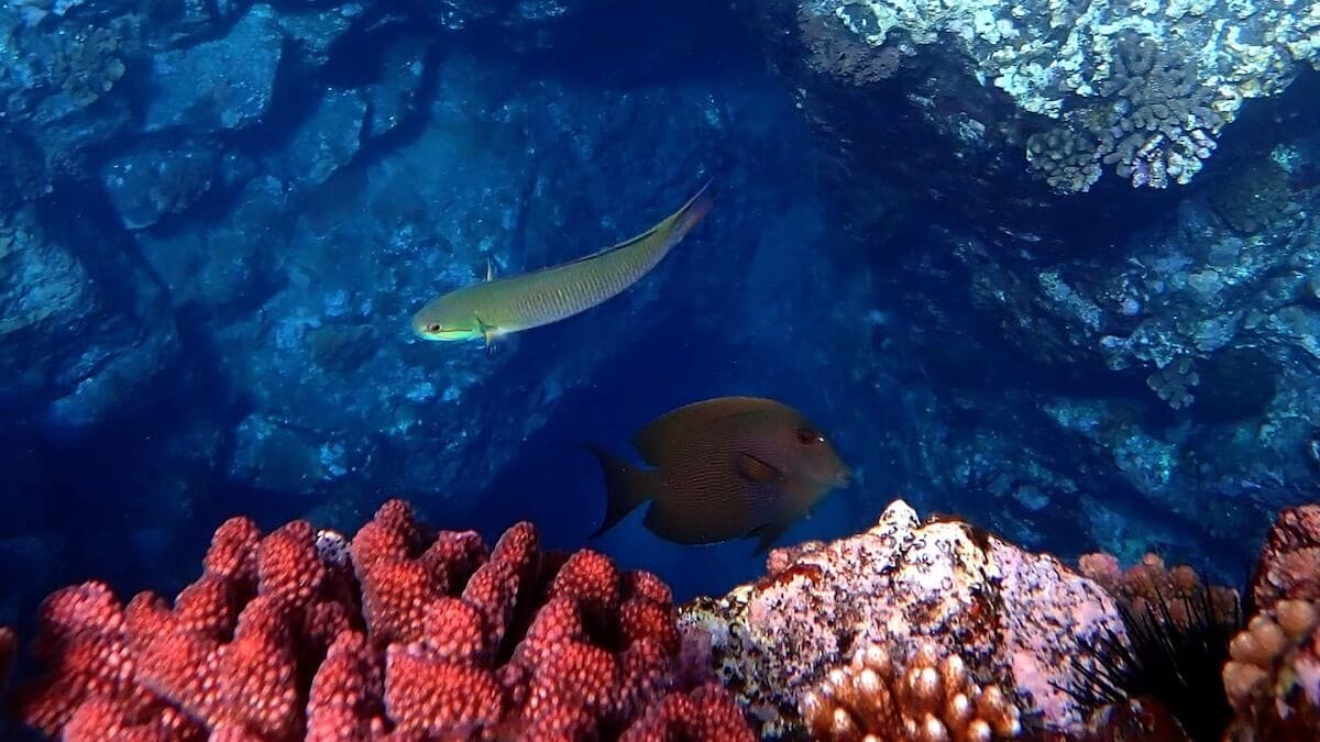 Cap Lahoussaye features varied underwater reliefs, including ridges, slopes, faults, and rocky drop-offs, often covered with hard corals. From the shore, the reef drops steeply to sandy areas about 59 feet deep.