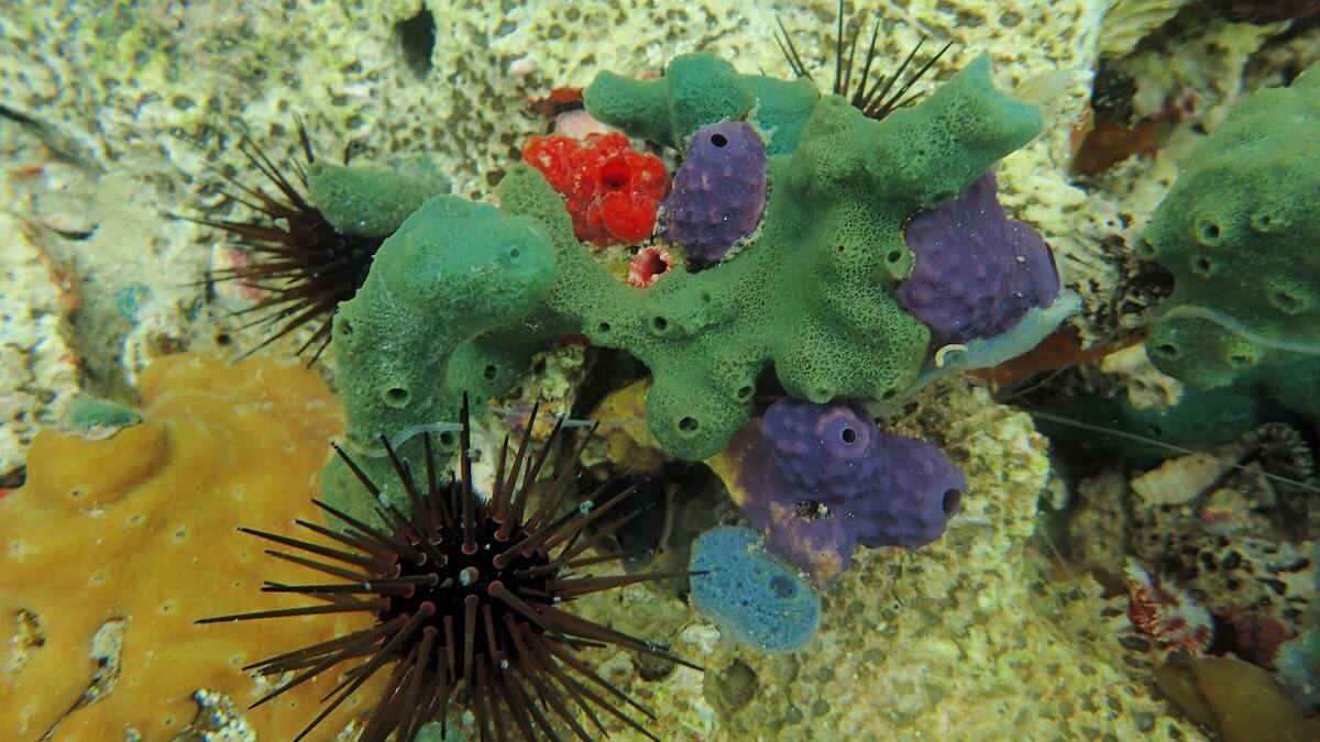 The depth is constant all over the reef area (↕10-12ft/3-4m). In the central part of the spot, small coral heads, covered in turquoise, golden or carmine sponges create a colorful underwaterscape.