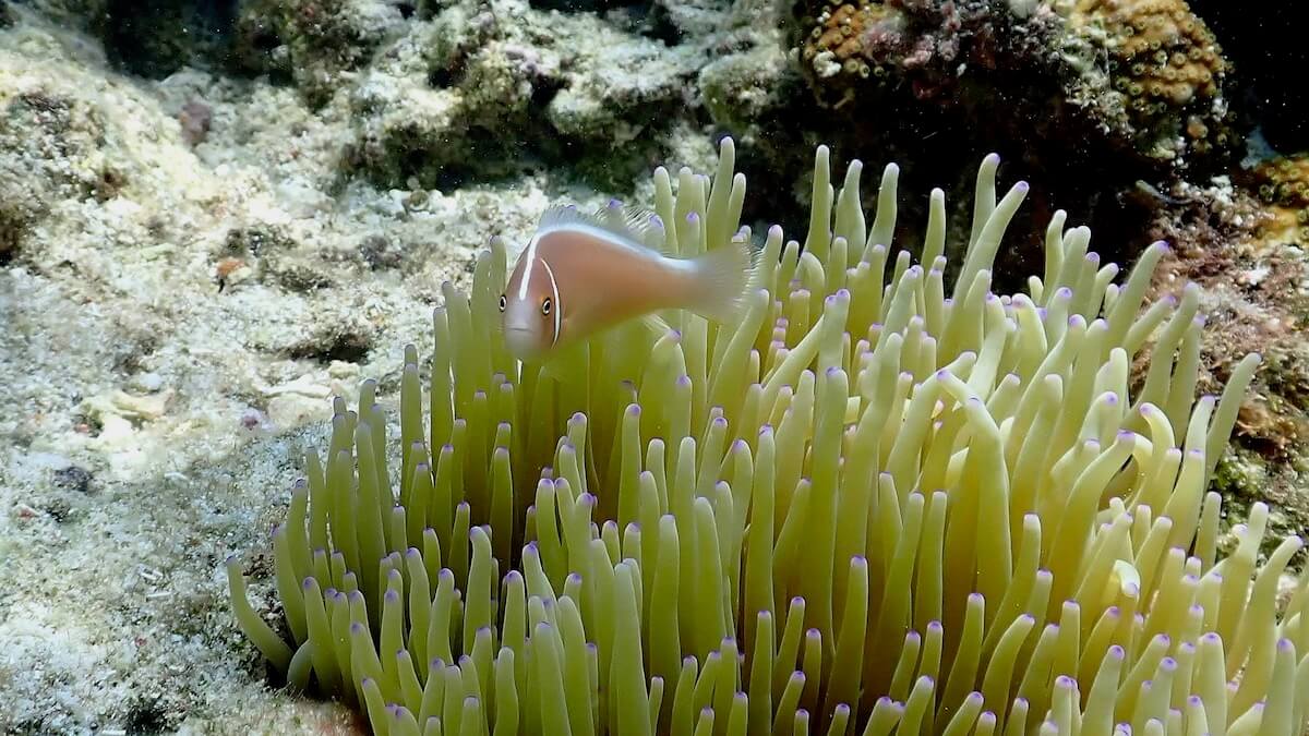 The reef flat (↕1-6 ft/0.5-3 meters) is covered with different types of corals, including finger coral, branching coral, and a collection of sea fans and sponges. On the drop-off, you will discover a spectacular and healthy profusion of corals, especially from a depth of 10 ft/3 meters.