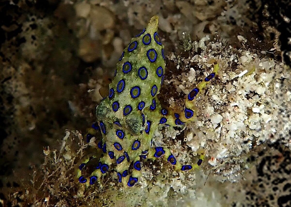 Many other “bucket list” creatures are active at night on the house reef, such as the waspfish, the ghost pipefish, and the blue-ringed octopus.