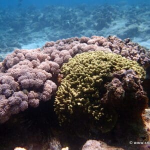 The first dozen yards or so from the beach (↕6-10ft/2-3m) are made up of damaged coral. In places, new colonies are taking root.