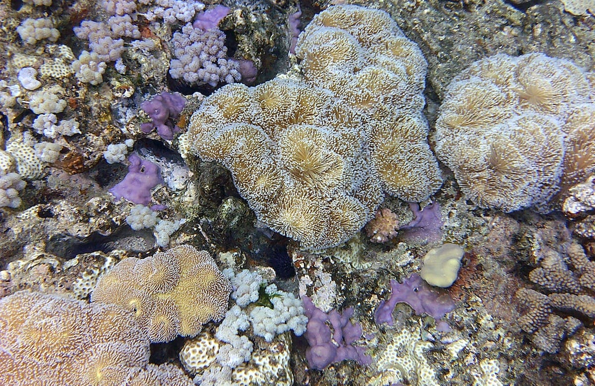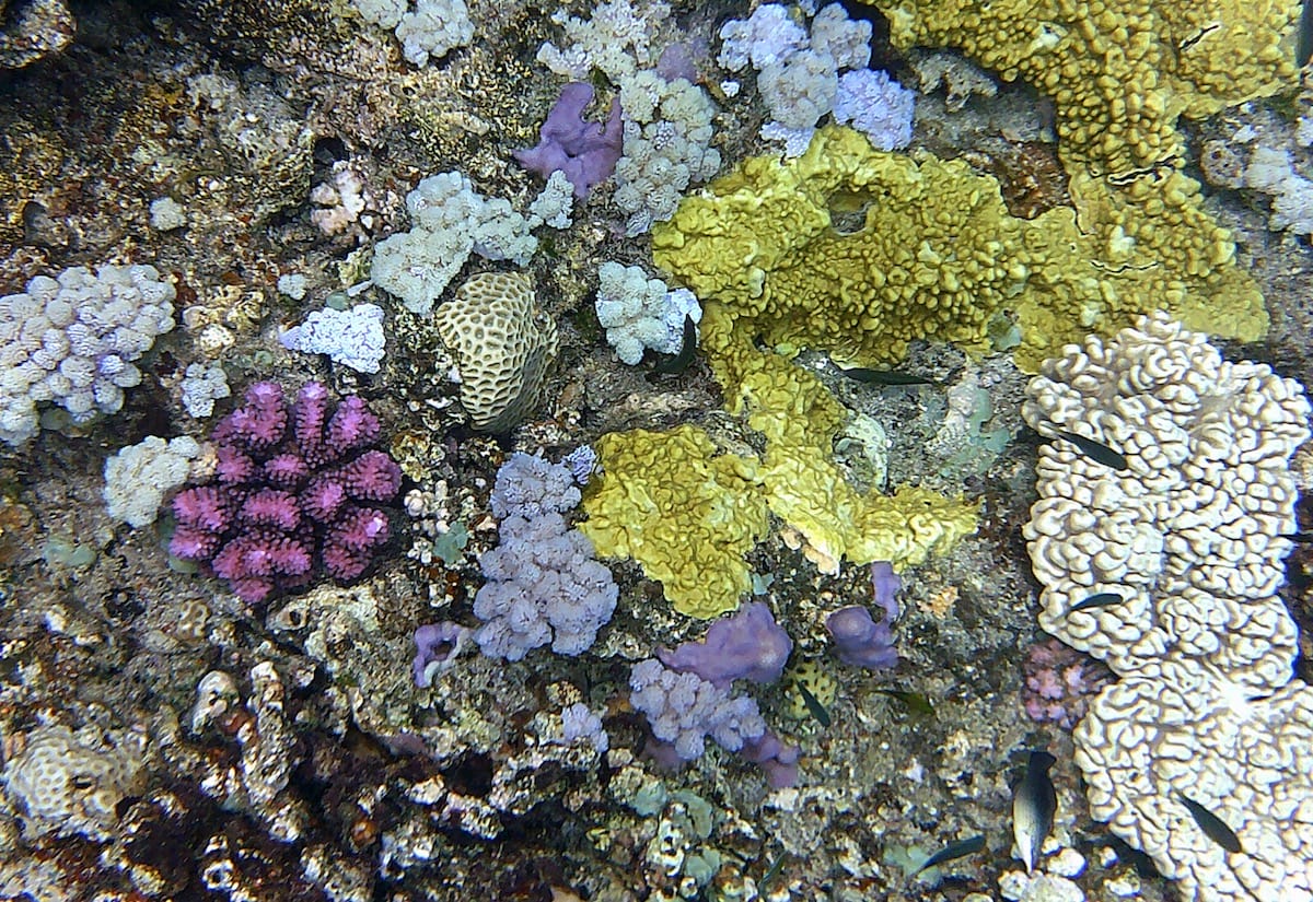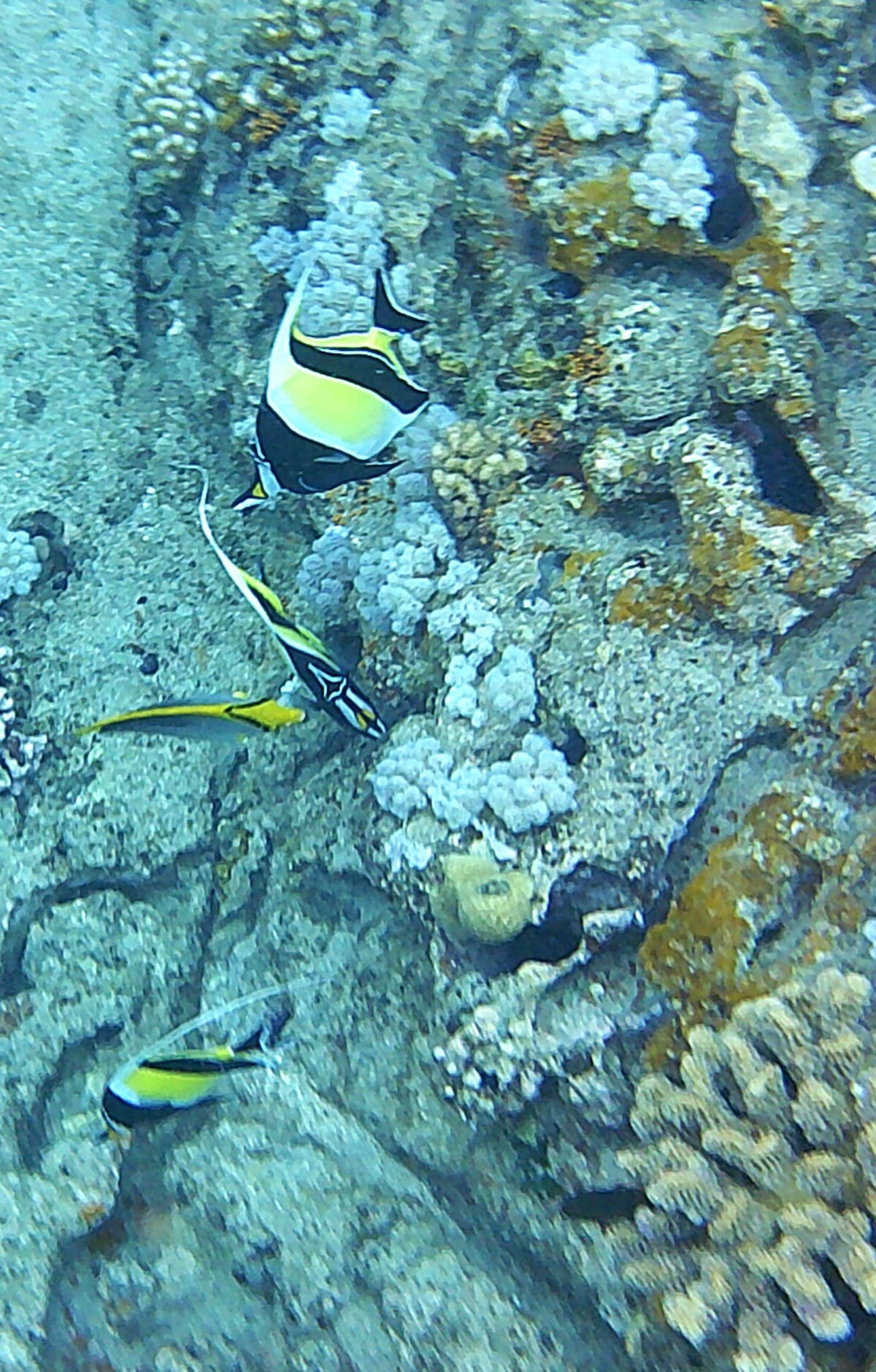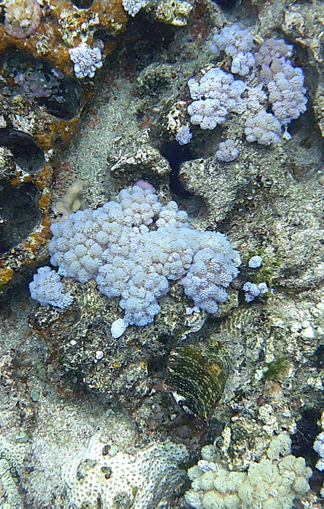 At the foot of the cliffs, the reef forms a shallow flat (↕0.5-1m), which then descends in irregular slopes (↕2-4m). On the reef, there is a beautiful diversity of hard coral (often very colorful), and some soft corals.