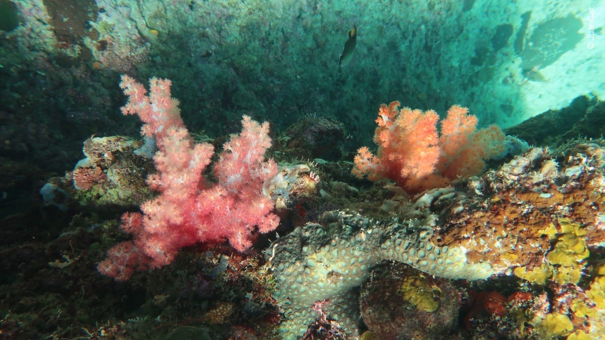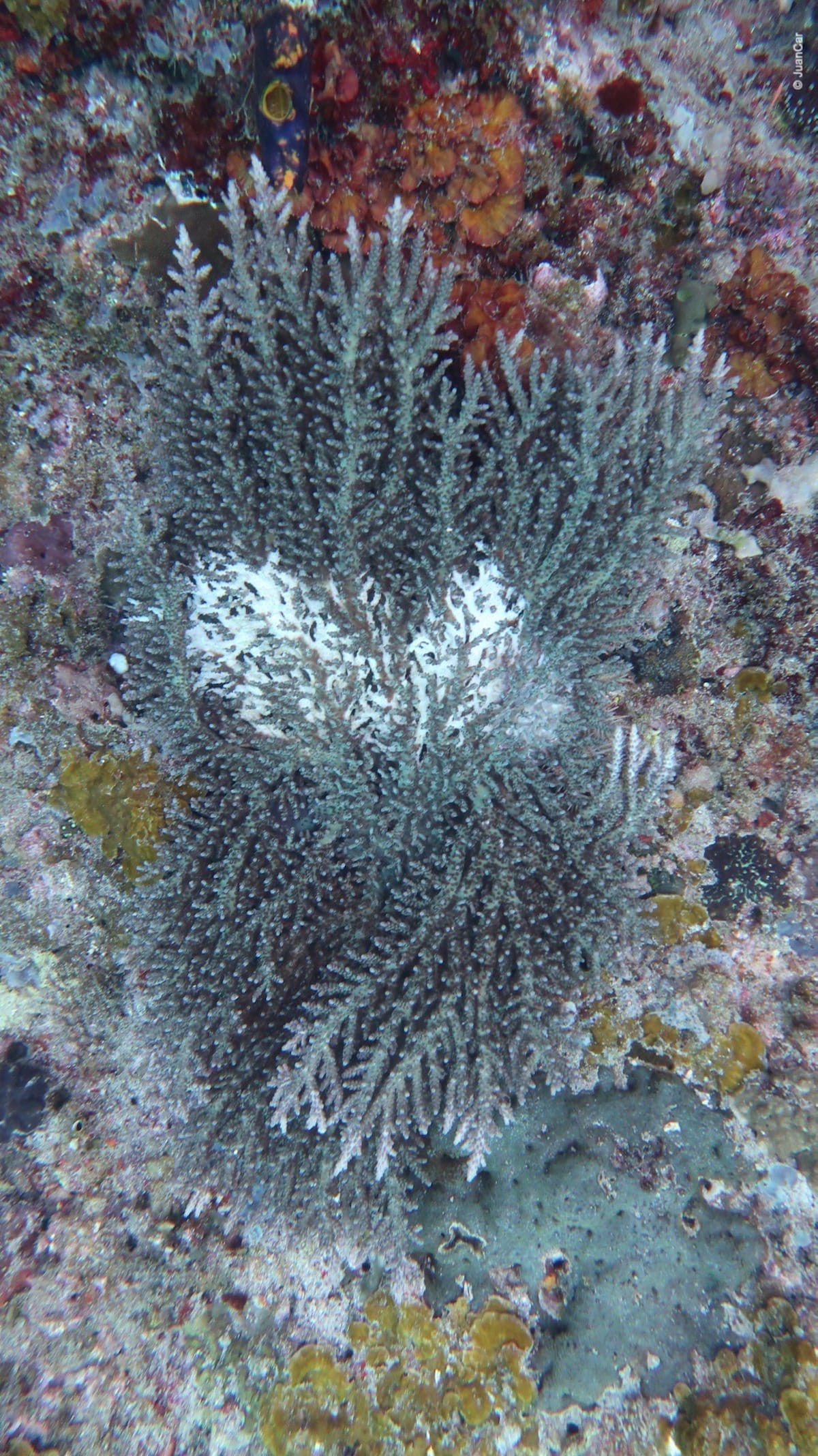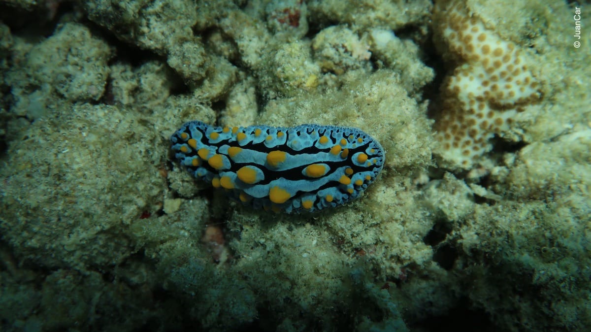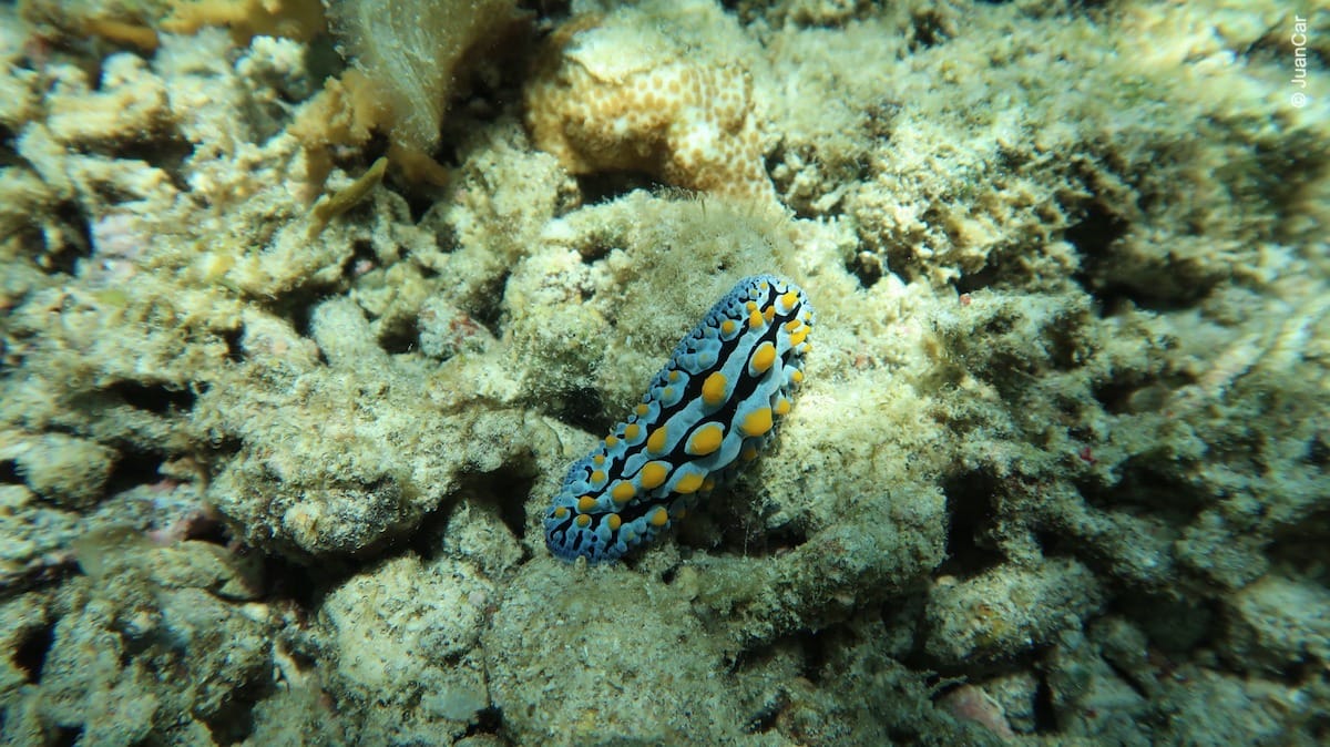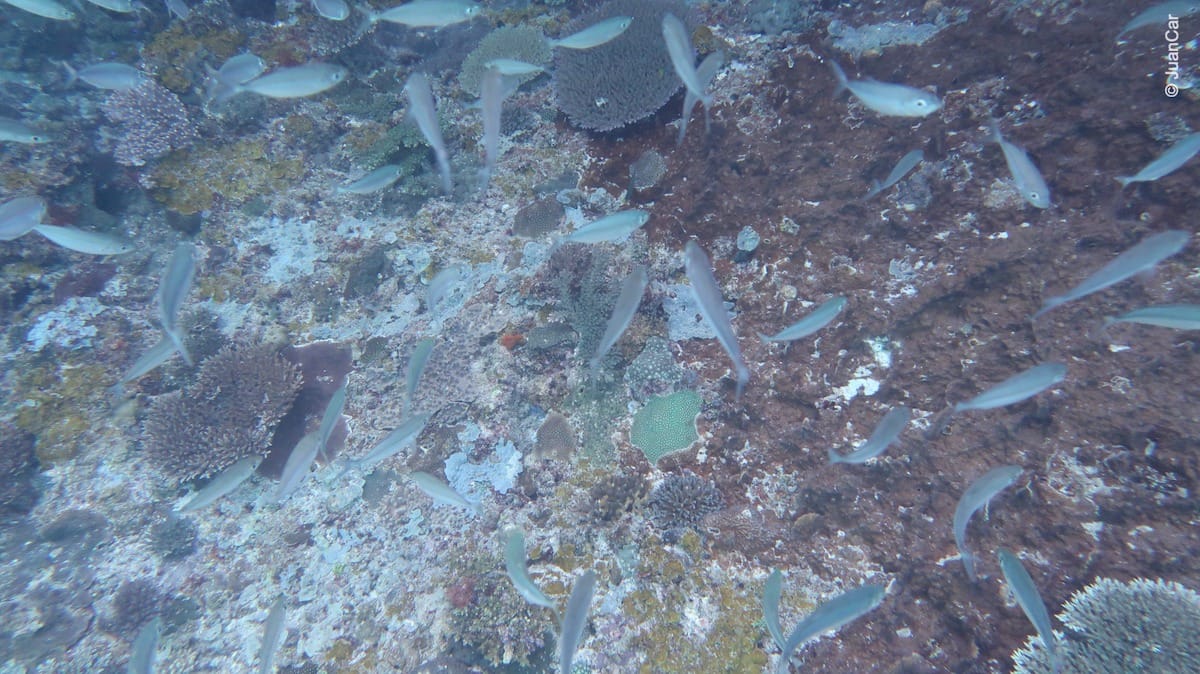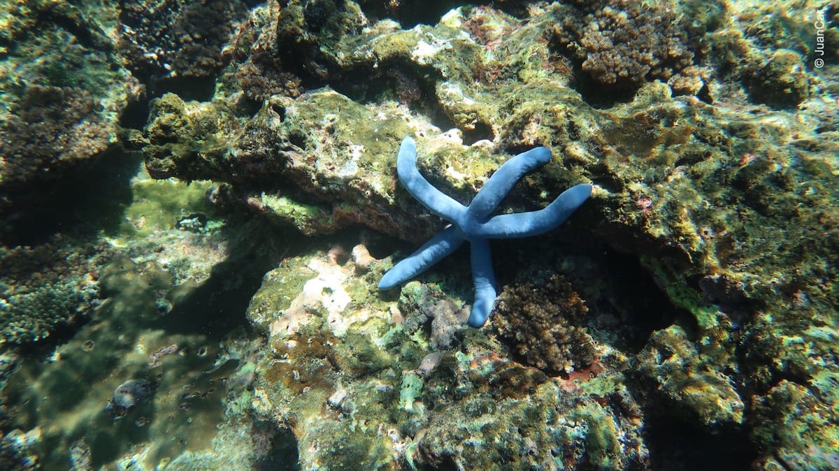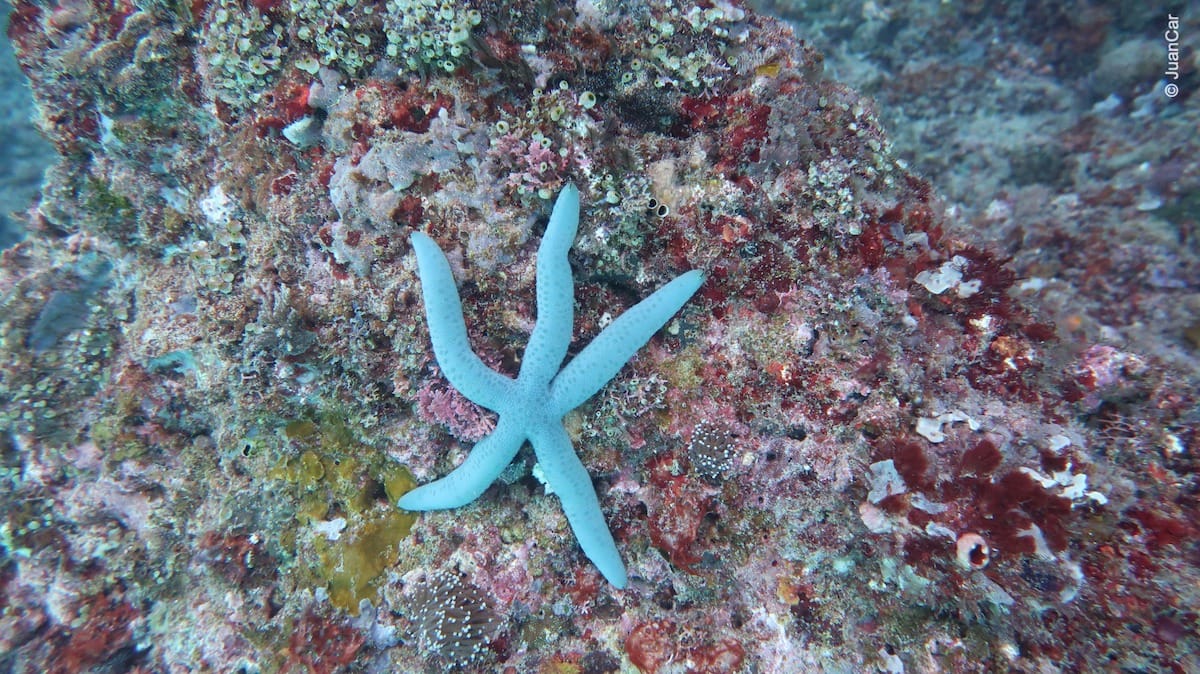 Clams, blue sea stars and nudis (the most common being the three colored phyllidia) are found here and there on the seabed. In the shallow areas, large schools of spinefoot and surgeons can be seen.