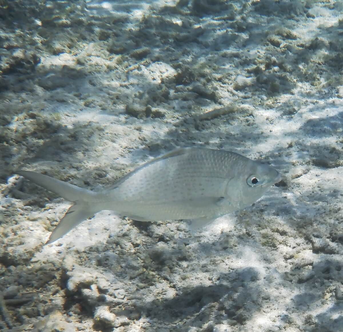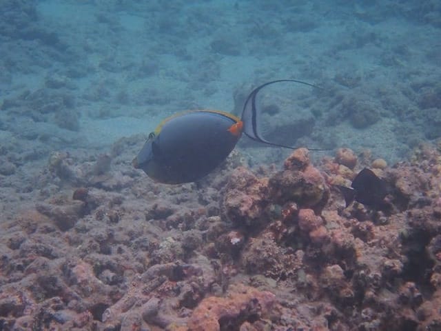 The area to explore is located between the beach and the coral reef, which are distant from 350 to 500 yards. The further you go to the right, the shallower the water is and the less coral you will see (replaced to the north by seagrass meadows – see map). The further left you go, the closer you will be to the channel, which is a hazardous area because of strong currents.