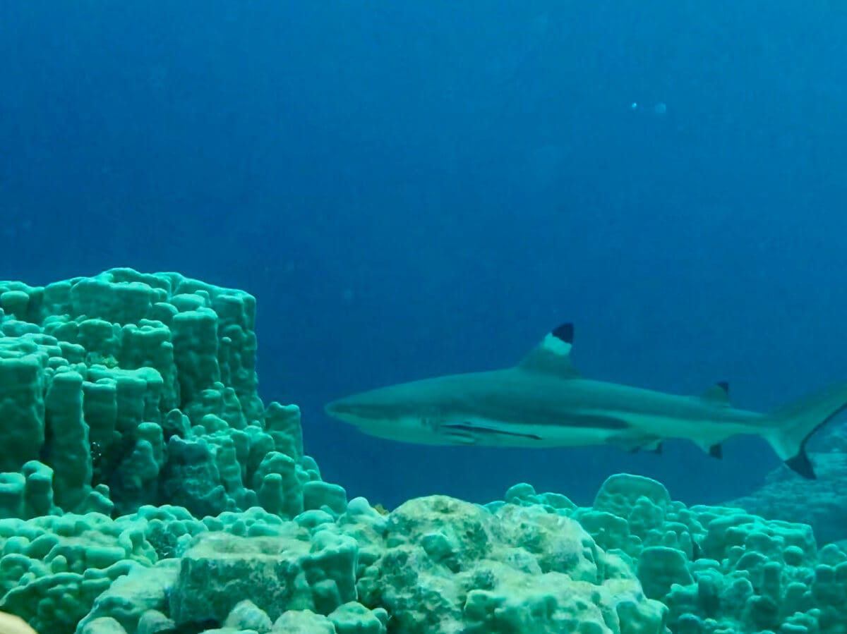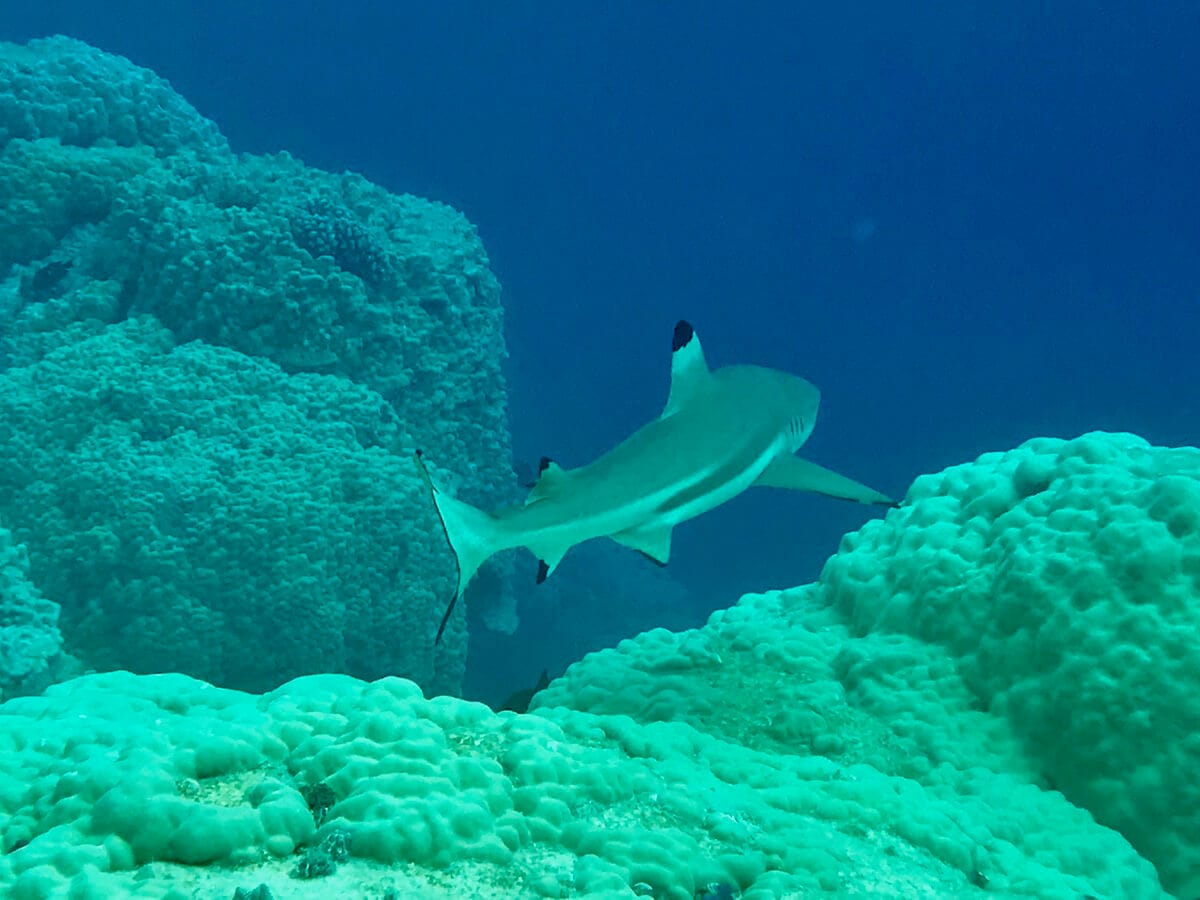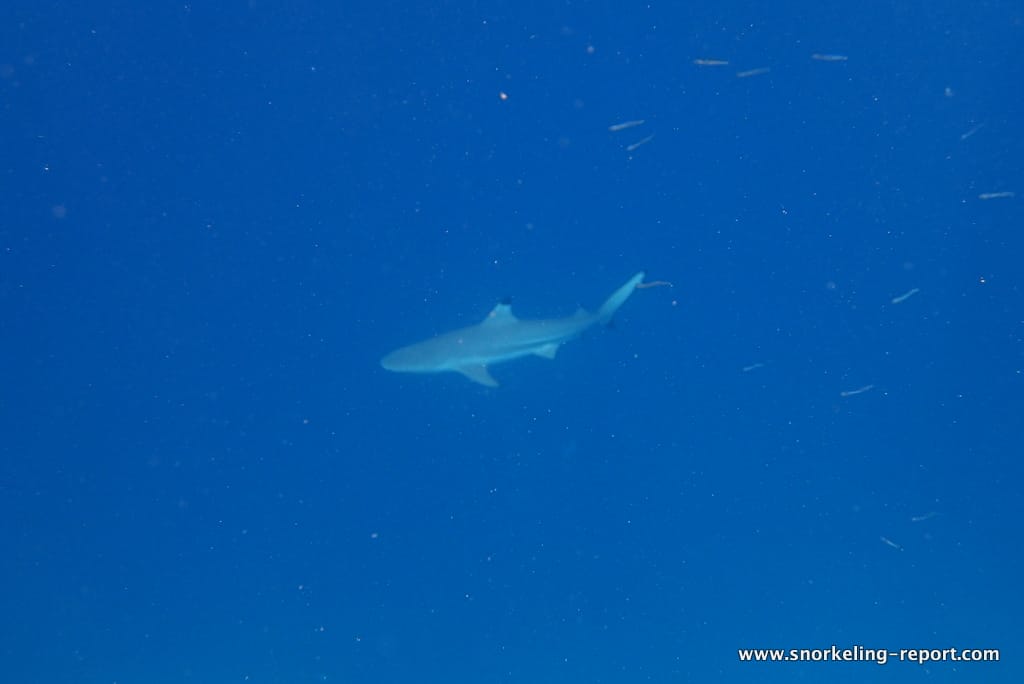 But the blacktip reef sharks living on the reef are the main attraction in this spot. You will probably see them swimming peacefully over the drop-off, or deeper down in the blue, where they sometimes come across barracudas.