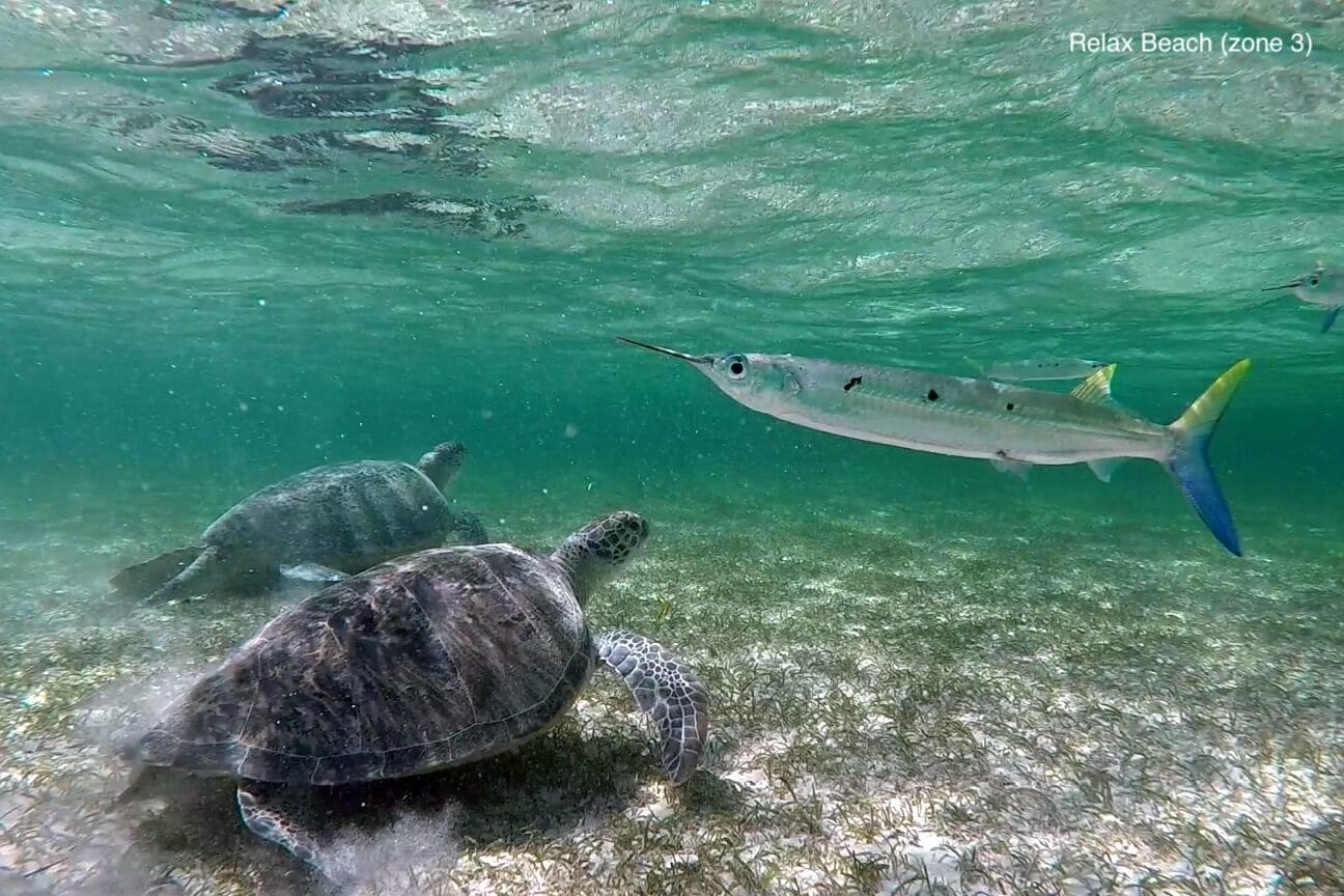 This area has more or less the same profile as area 1, a shallow lagoon dug in the flat, but it also has something very special: its seagrass beds are visited by green sea turtles which are pretty easy to see in the shallows.