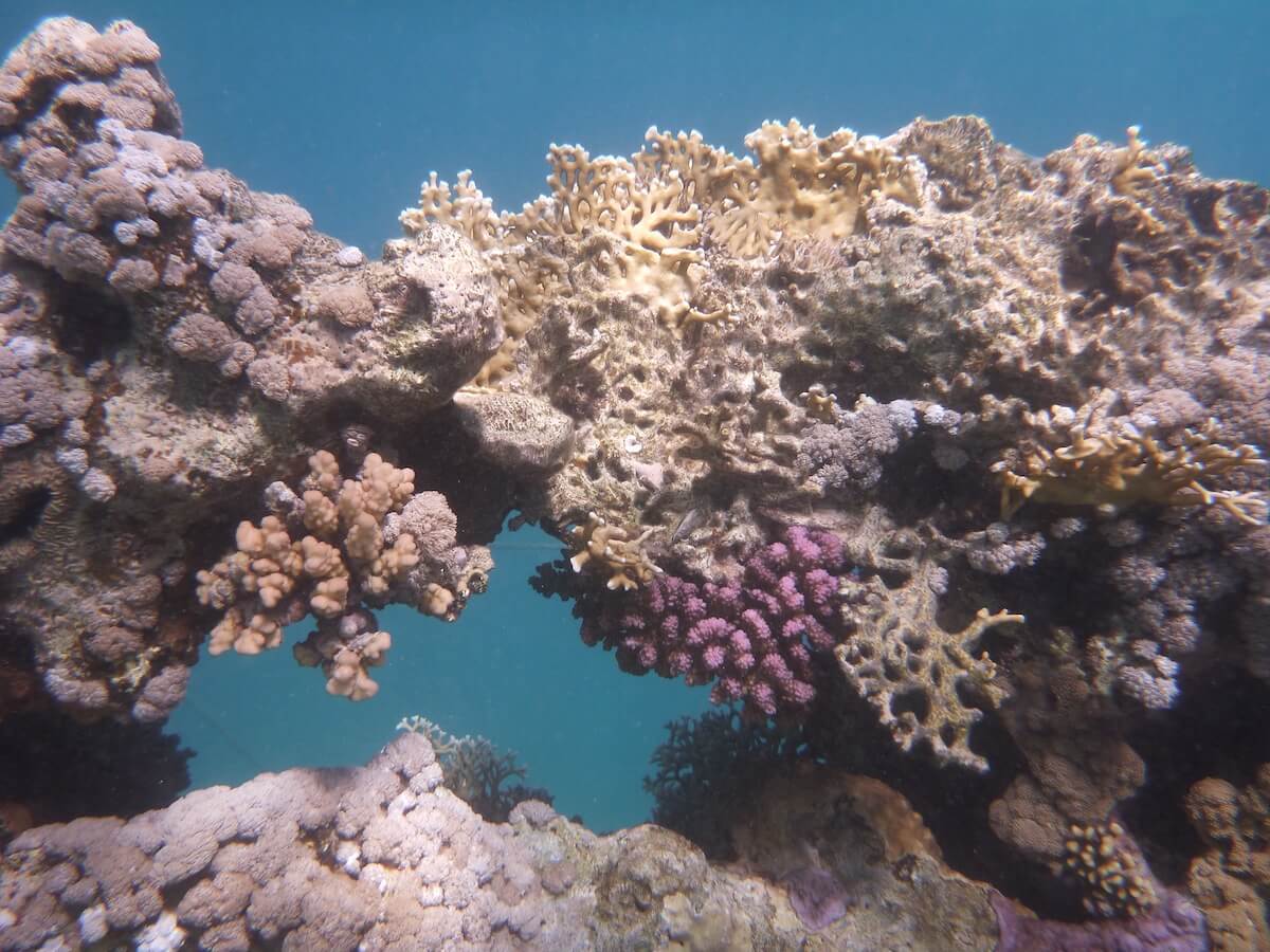 The edge of the lagoon has many corals. The corals are in fair condition with arbor pink, bluish or yellow colors. This environment is favored by small reef fish, such as butterflyfish, pufferfish, and several species of wrasse. Moray eels sometimes hide in the cracks, while rays are often seen in the central sandy beds.