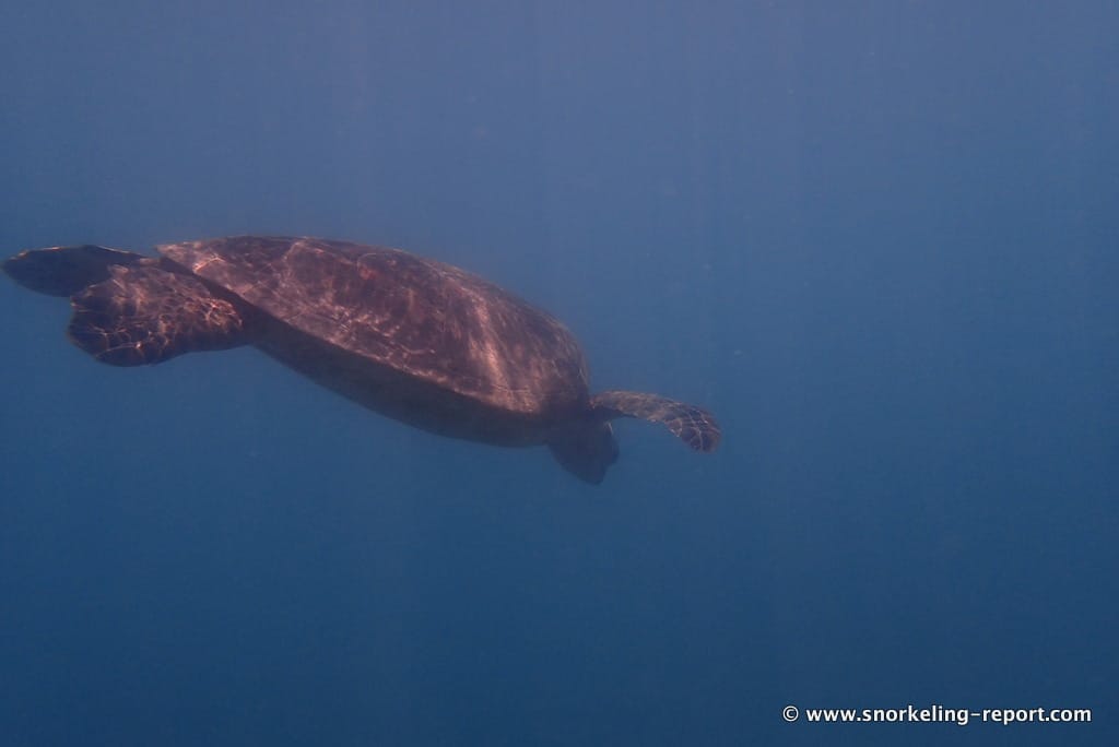 2/ The reef which faces the main beach of the island east of the dock, about opposite the resort (zone 2 on the map). If you find the beach to be less pleasant, this spot is the best place around the island to swim with green sea turtles. They are most often found in areas where depths are 6 to 12 ft/2 to 4m, at the reef edge (see map).