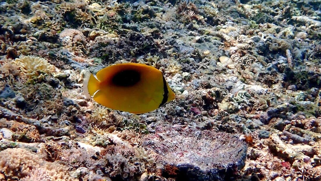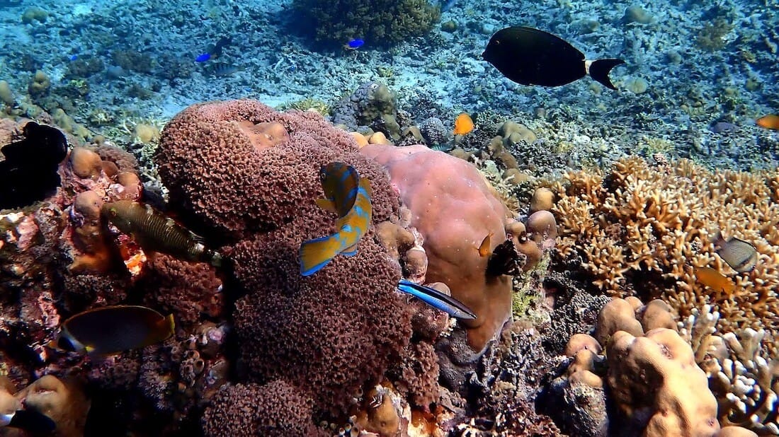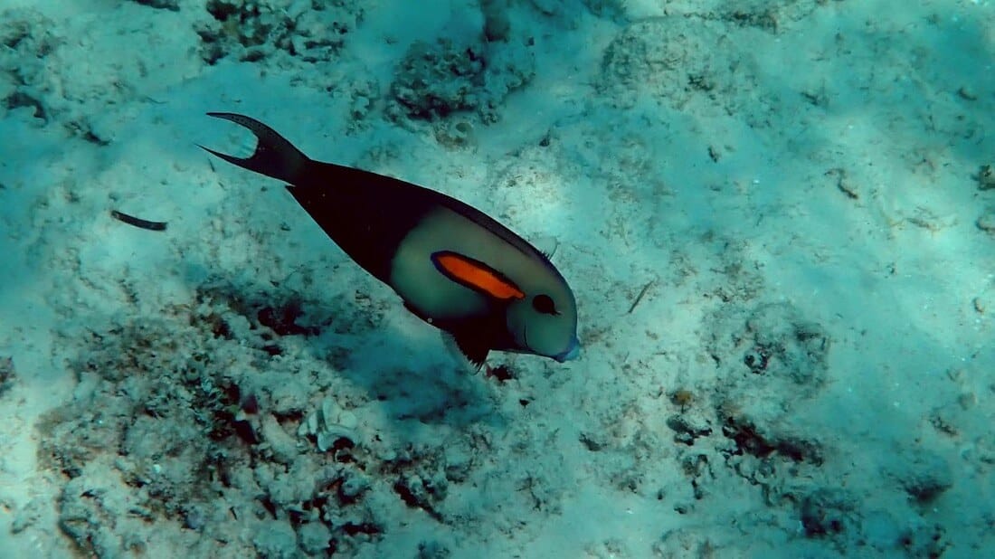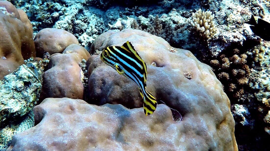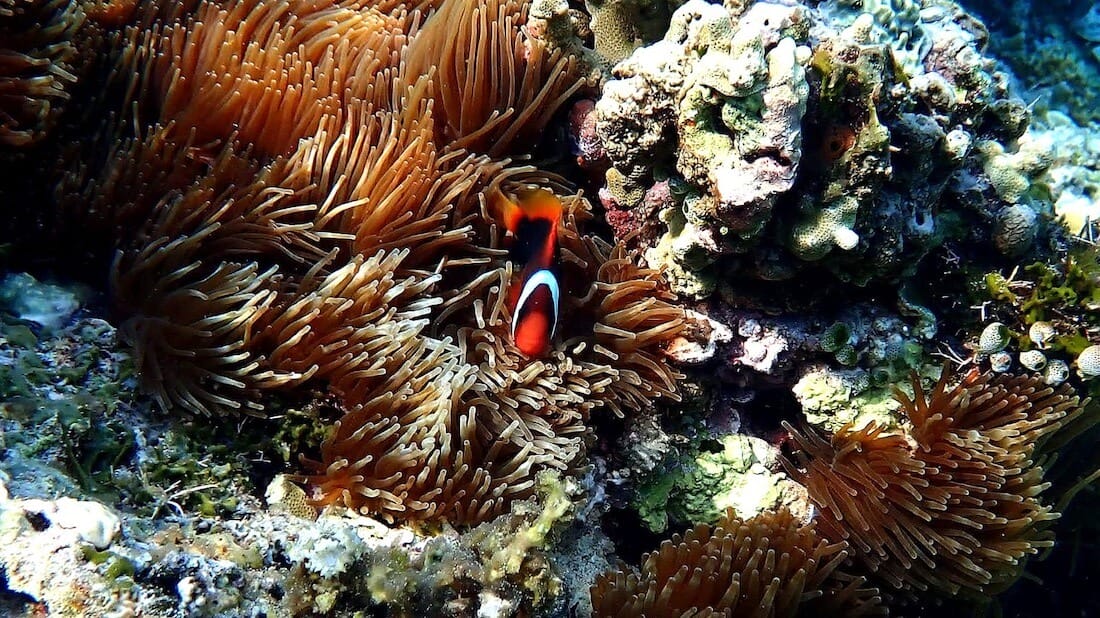 Soft and hard corals, even if some areas are suffering from human presence, covers the seabed. Snorkel along the reef and at various points you will come across shoals of surgeonfish, sunburst butterflyfish, groups of sea goldies, or even (if you are lucky), ocellaris clownfish (Amphiprion ocellaris) in their sea anemone.