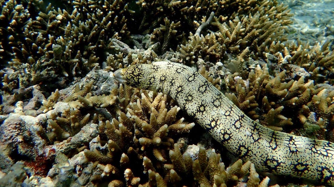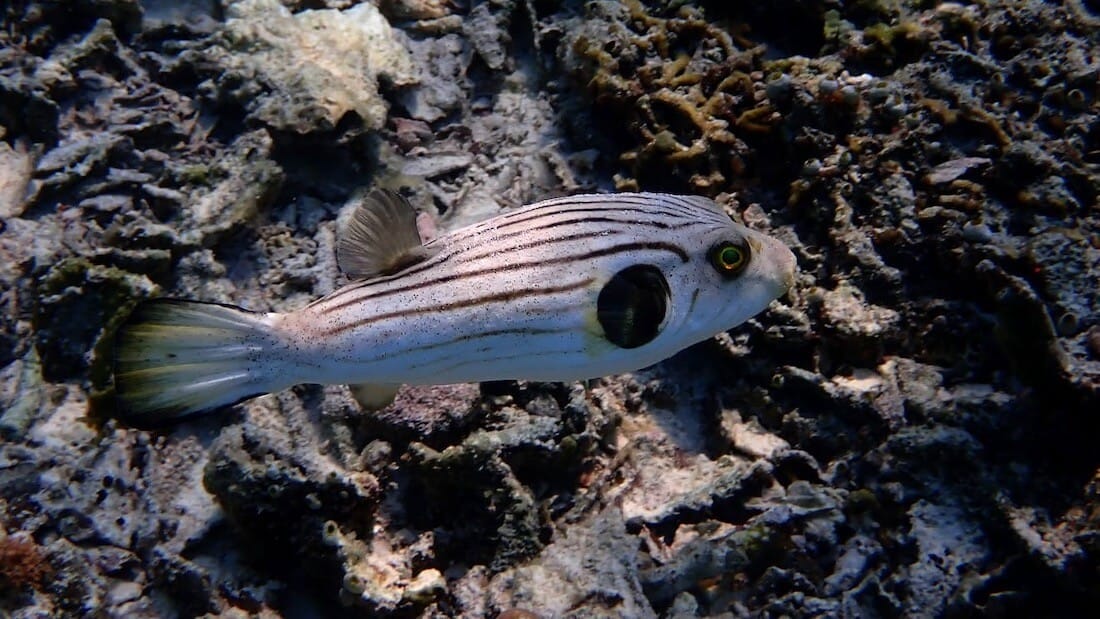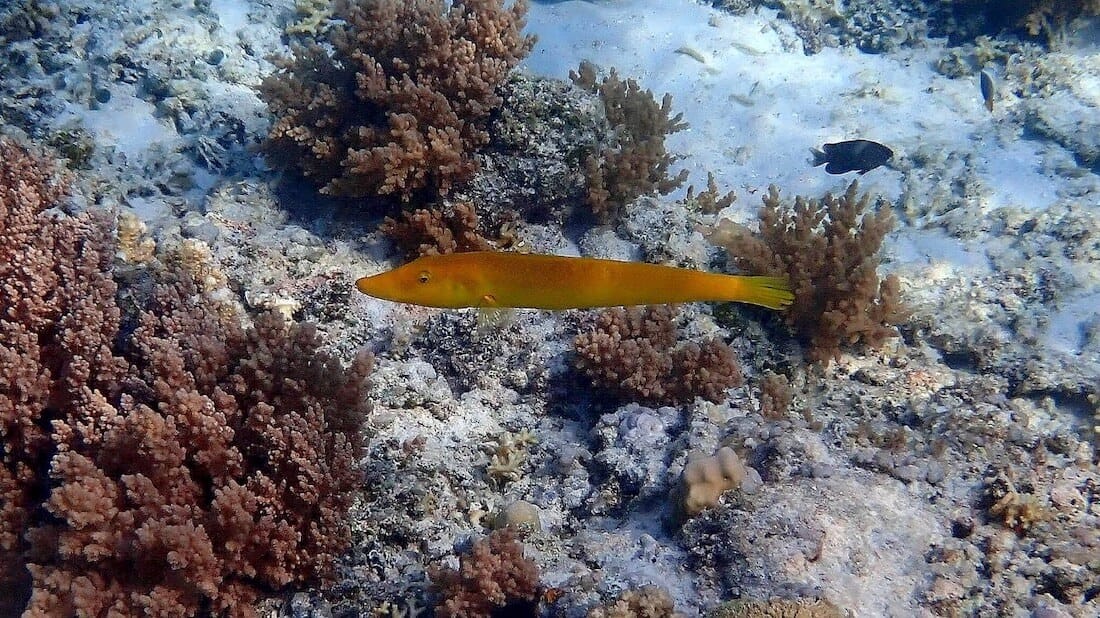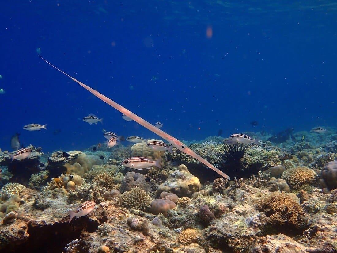 Soft and hard corals, even if some areas are suffering from human presence, covers the seabed. Snorkel along the reef and at various points you will come across shoals of surgeonfish, sunburst butterflyfish, groups of sea goldies, or even (if you are lucky), ocellaris clownfish (Amphiprion ocellaris) in their sea anemone.