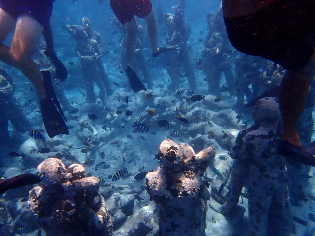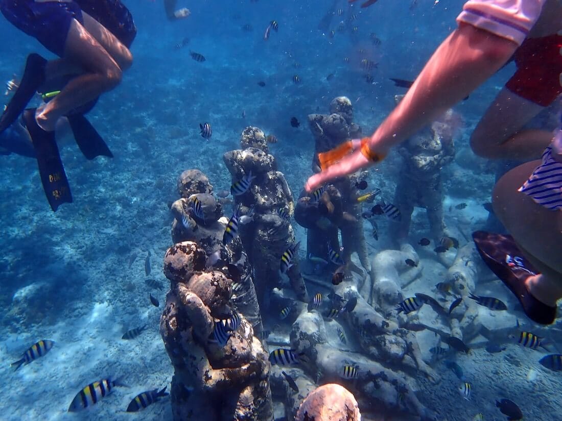 Some 100 yards from the shore, snorkelers can also spot the “Nest”, 48 life-size human sculptures, formed in a circle, created by the artist Jason deCaires Taylor (check map above for exact location).