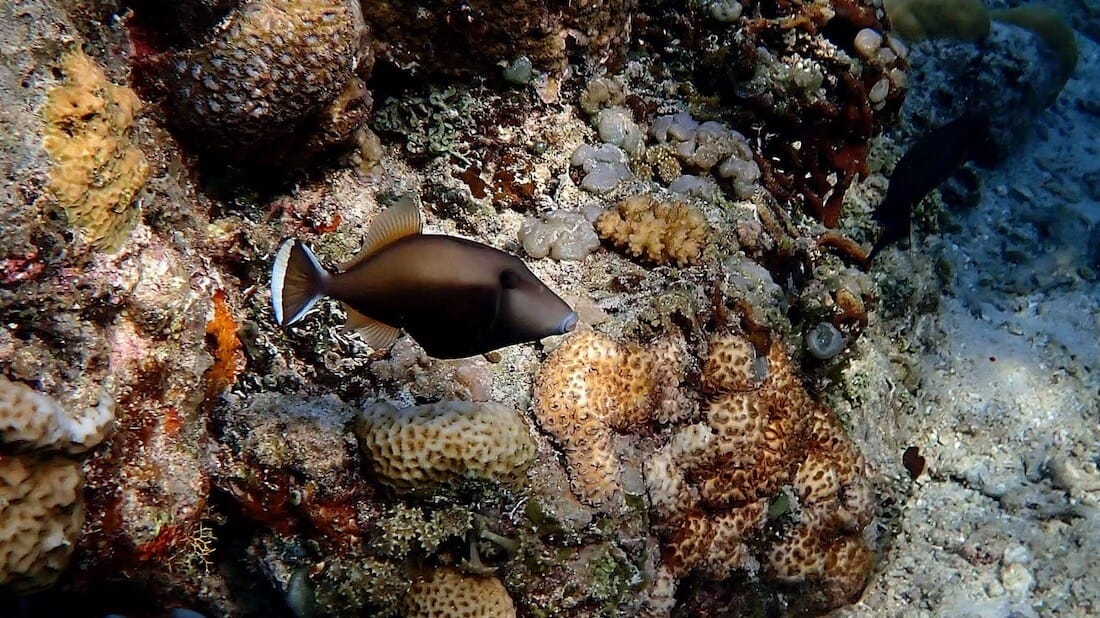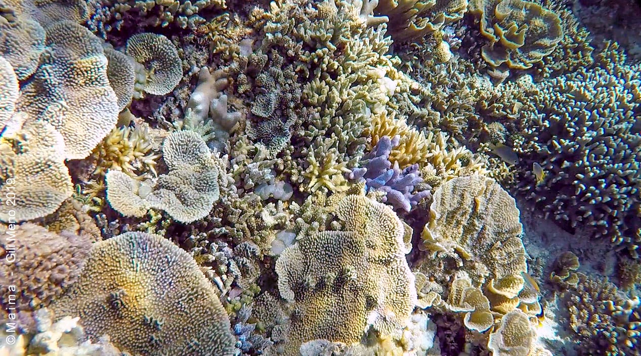 The area to explore covers a 164 to 218 yards-wide area between the beach and the reef drop-off. At this point, when starting from the beach, you will cross a few dozen yards of sandy areas and seagrass (↕2-6ft/0.5-2m), then a sea bed covered with coral (↕6-10ft/2-3m) as far as the reef drop-off (↕+20ft/6m).