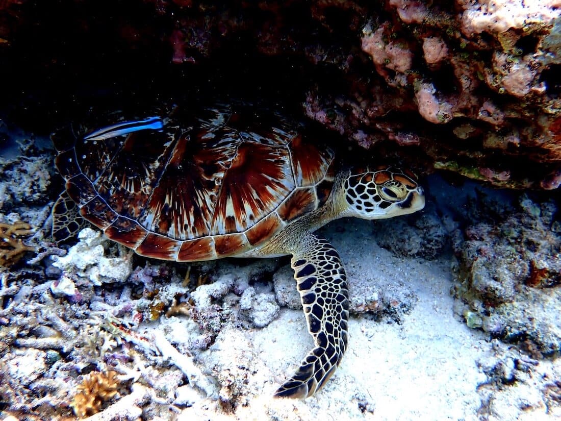 The sea turtles are hard to miss on this spot. Two species, the green sea turtle and the hawksbill sea turtle, are mostly seen in the coastal waters of the island, sometimes just 5 to 10 yards from the beach. They feed on the sea grass, but you can also meet them on the coral areas along the drop-off, especially at high tide.