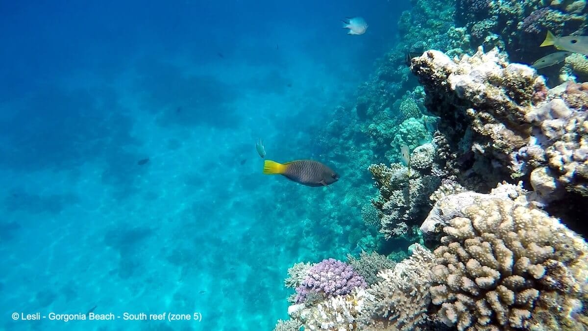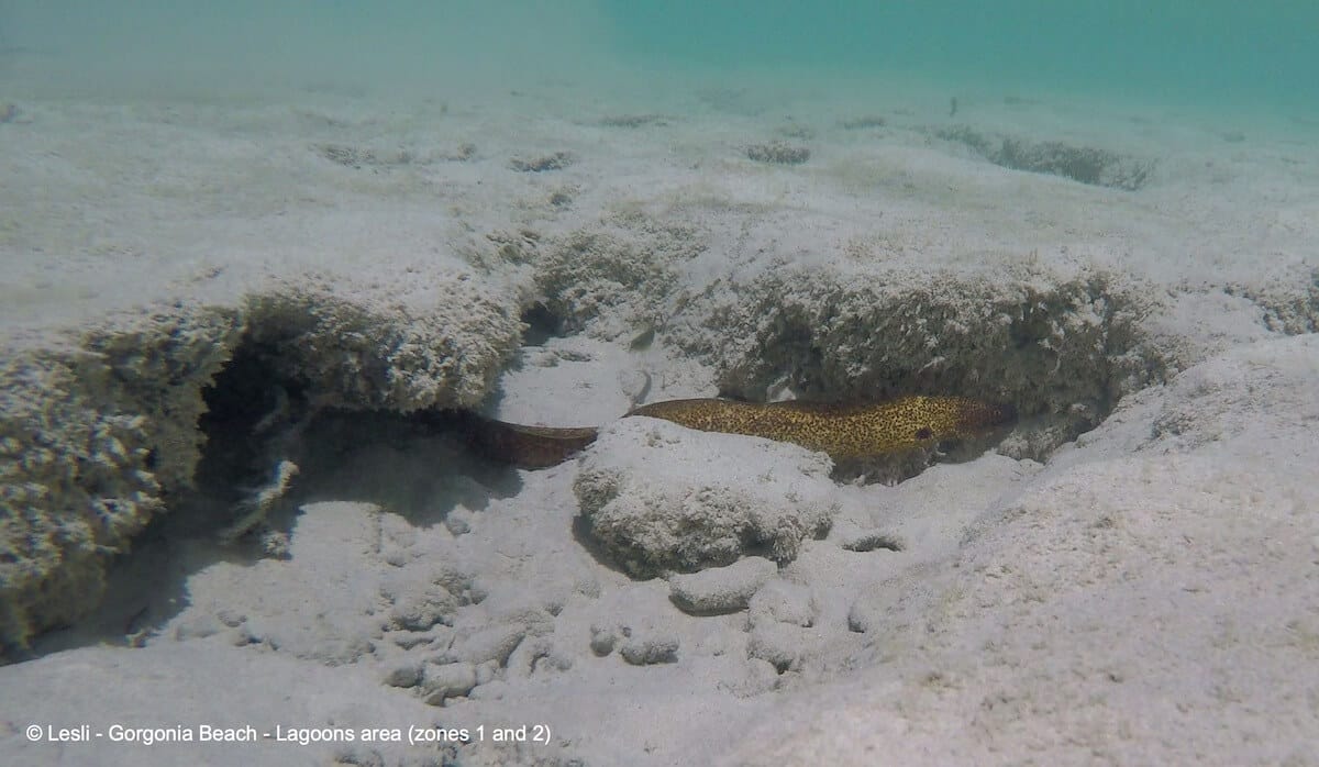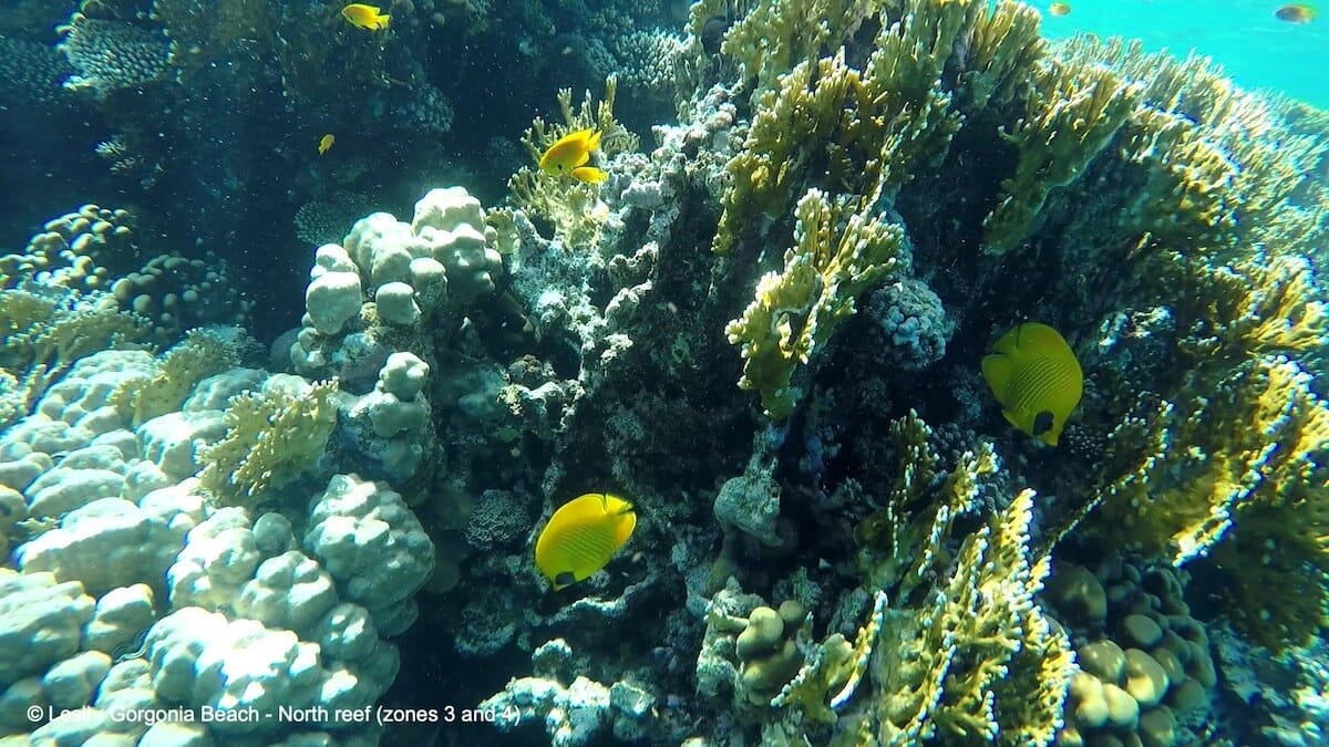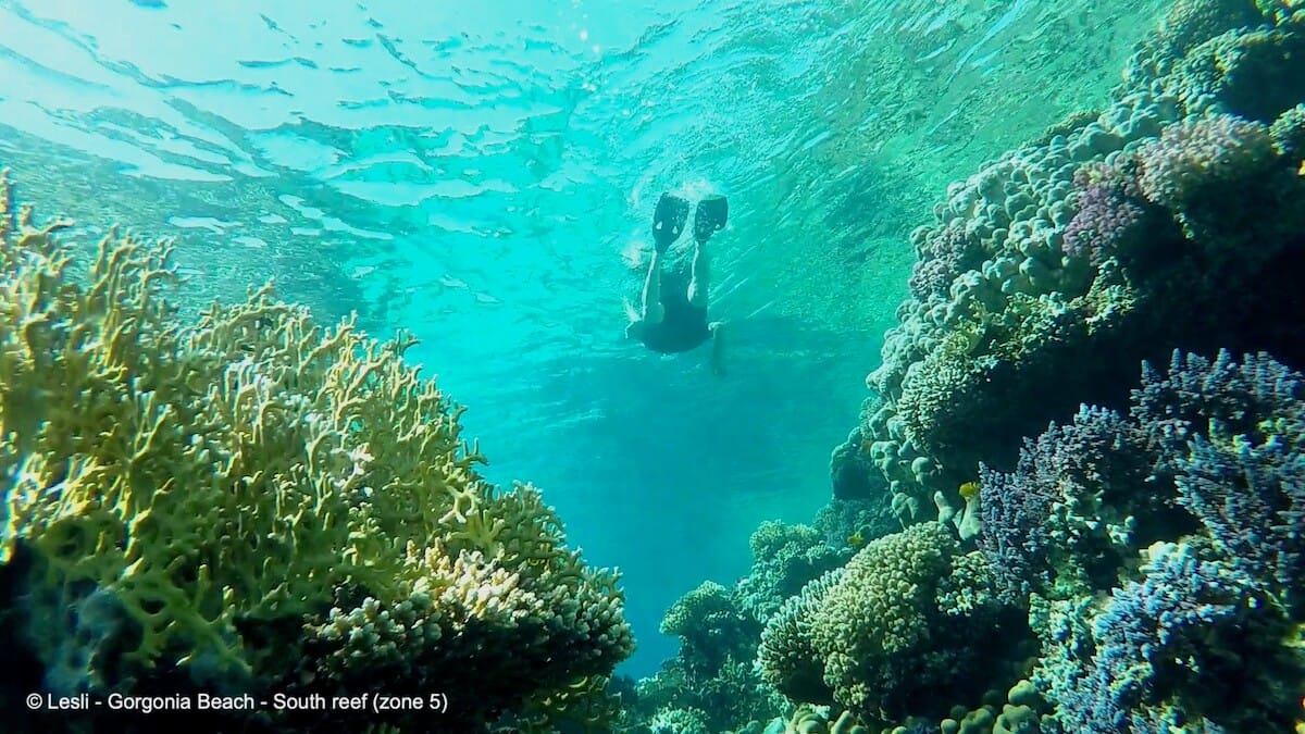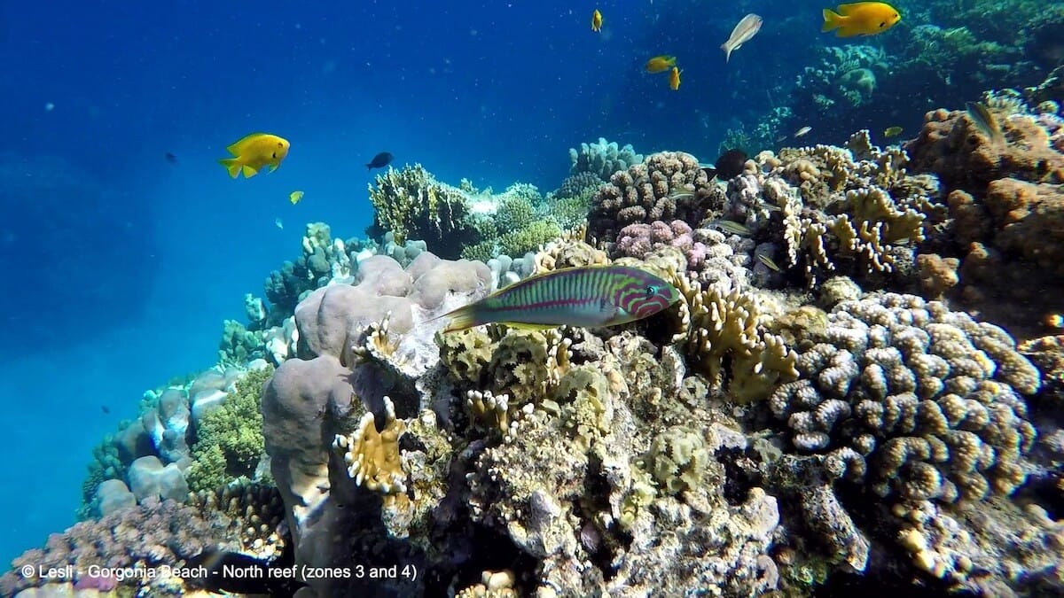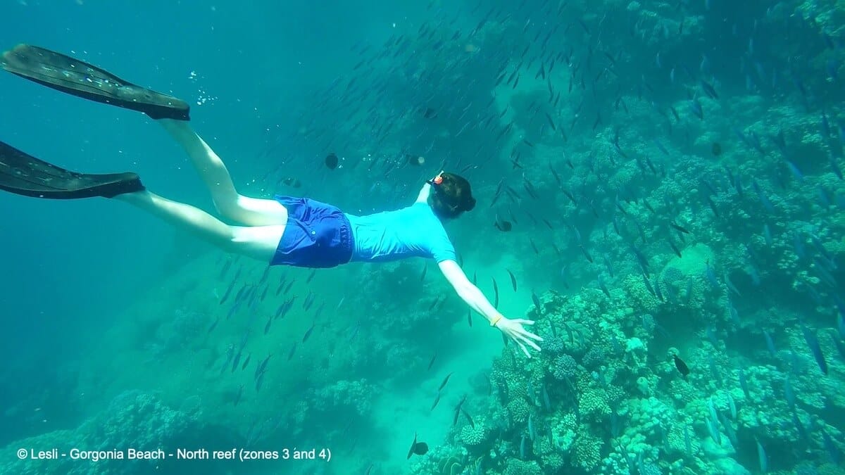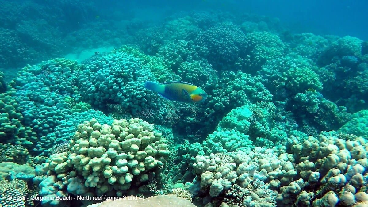 The main Gorgonia Beach snorkeling area is located at the end of the pontoon (zone 3 on the map above). Once in the water, swim along the reef drop off, which extends all along the coast, on both sides of the pontoon. Be careful not to let you caught by the current, if strong.