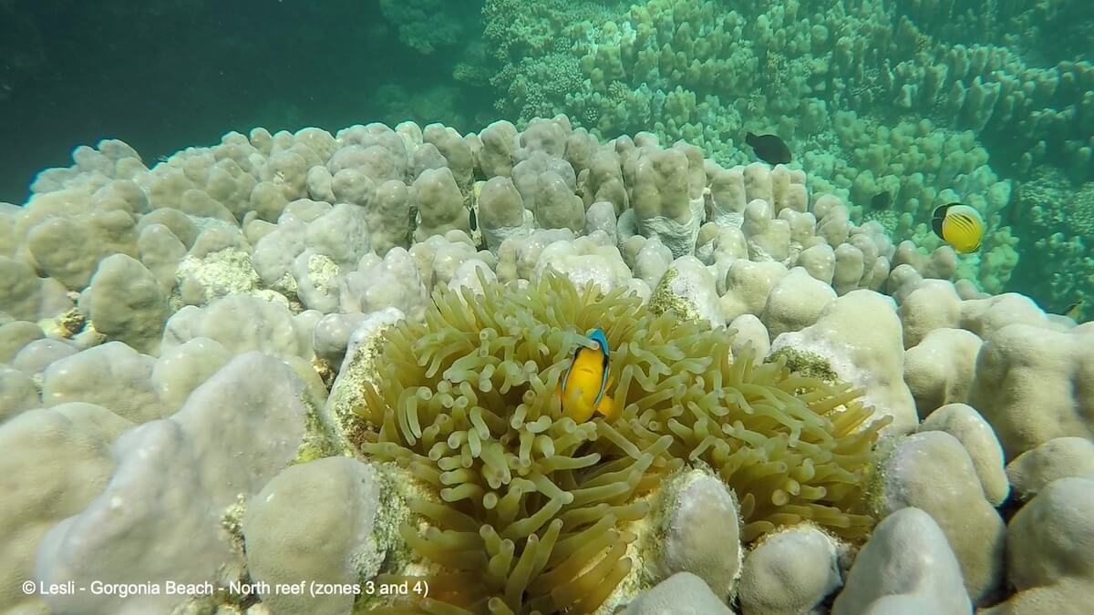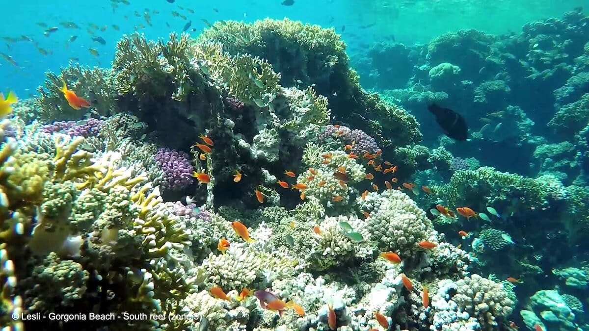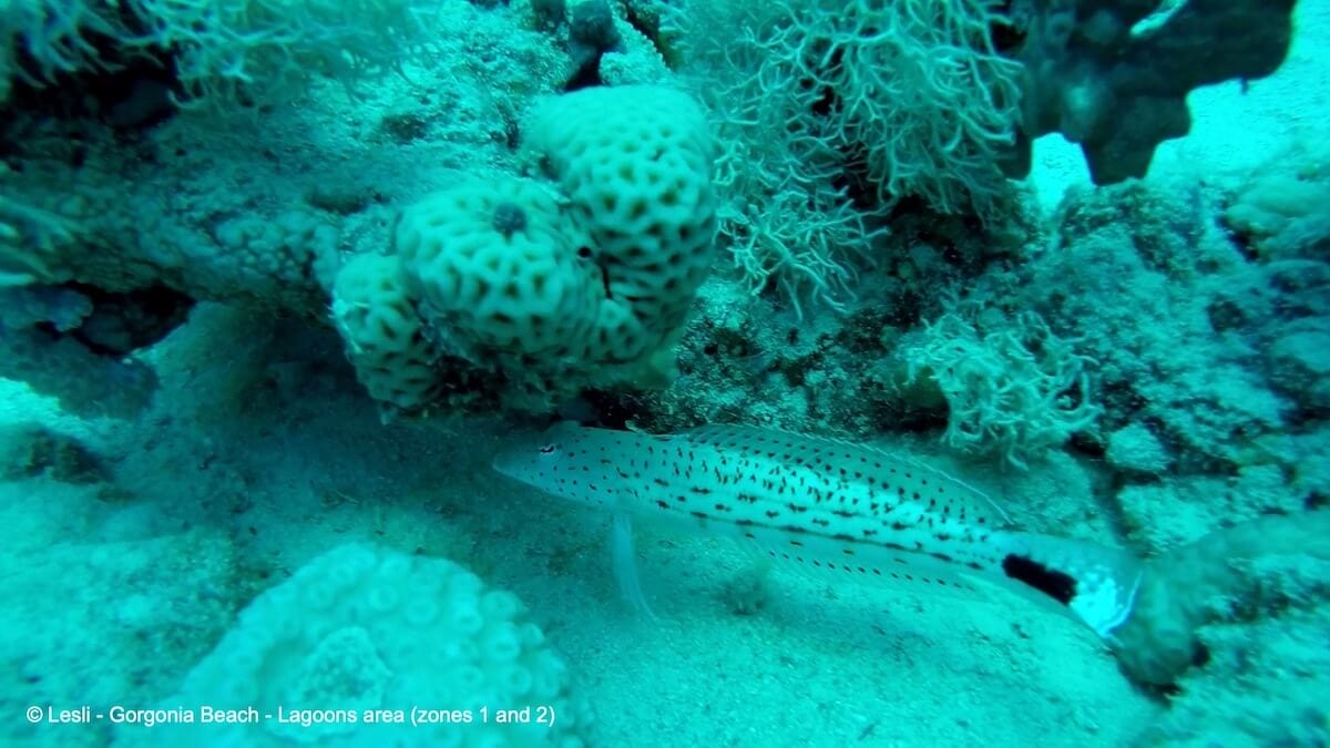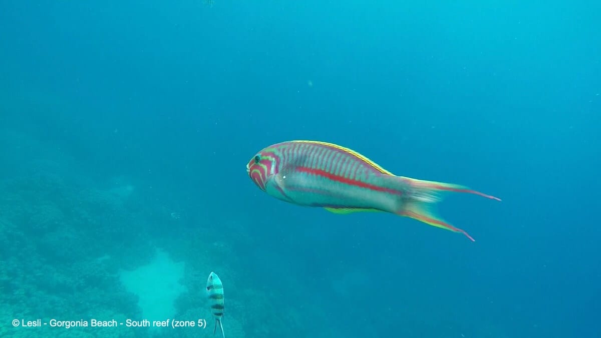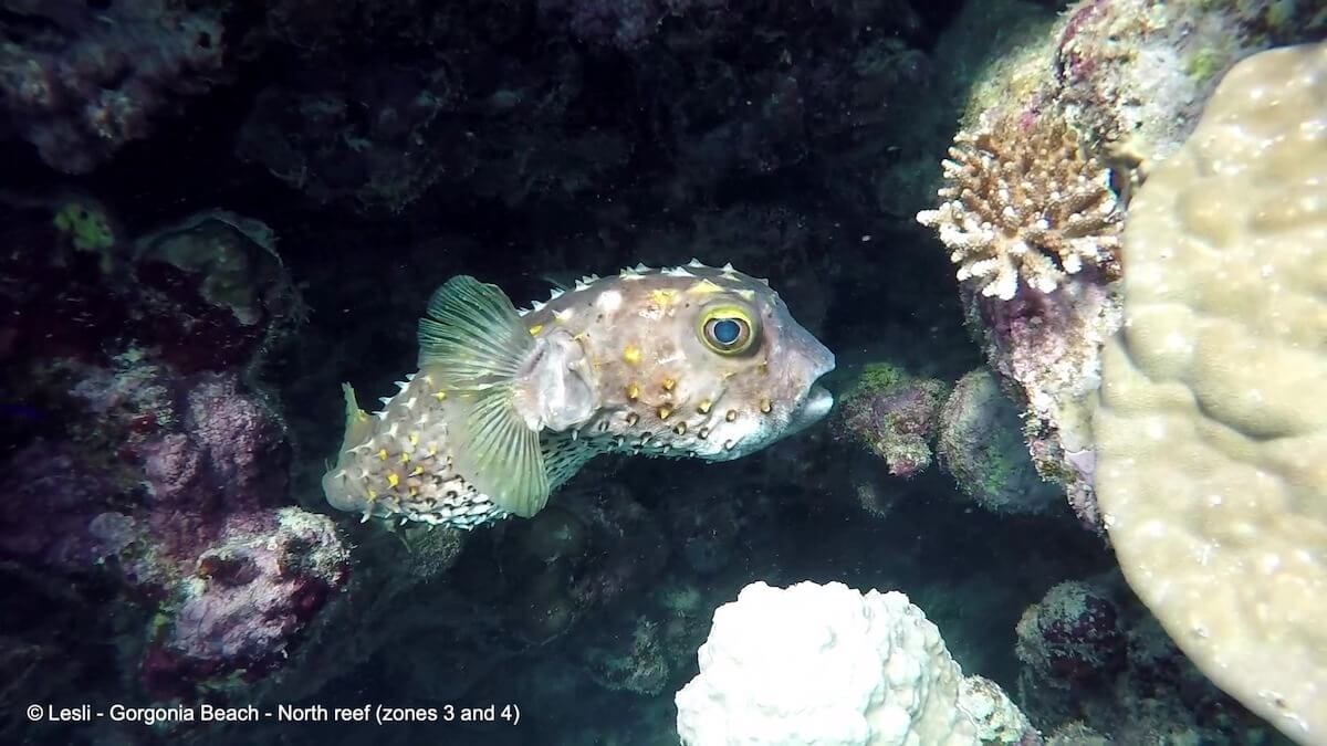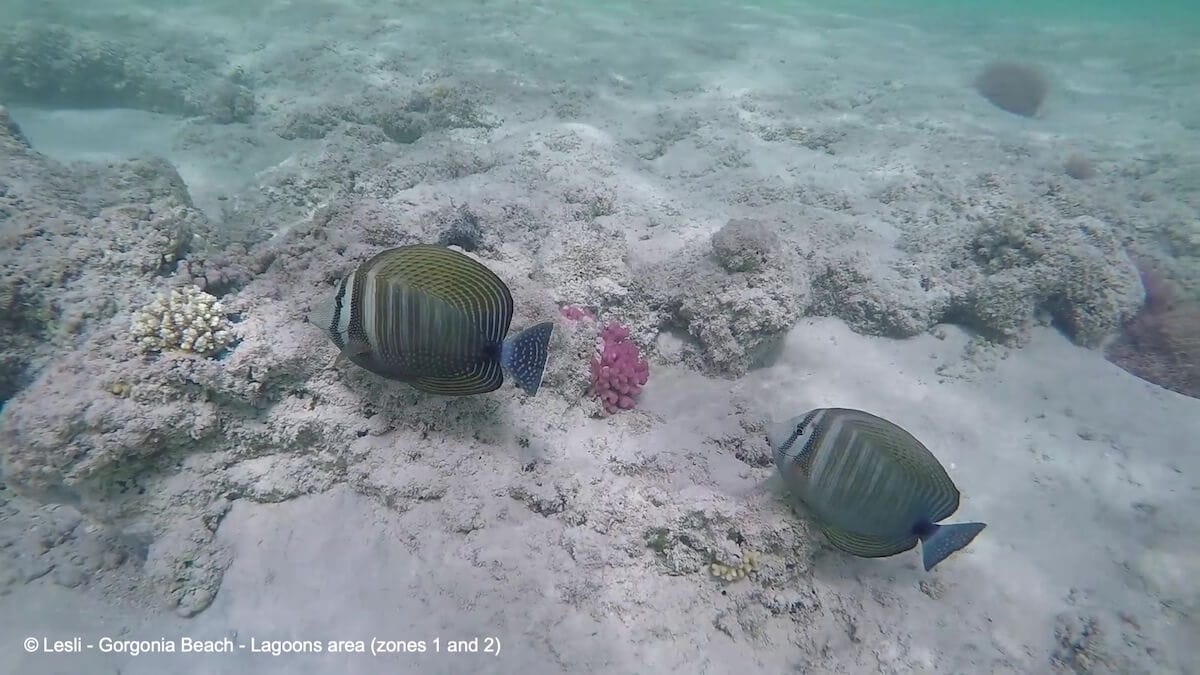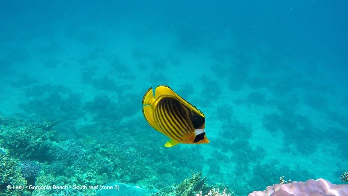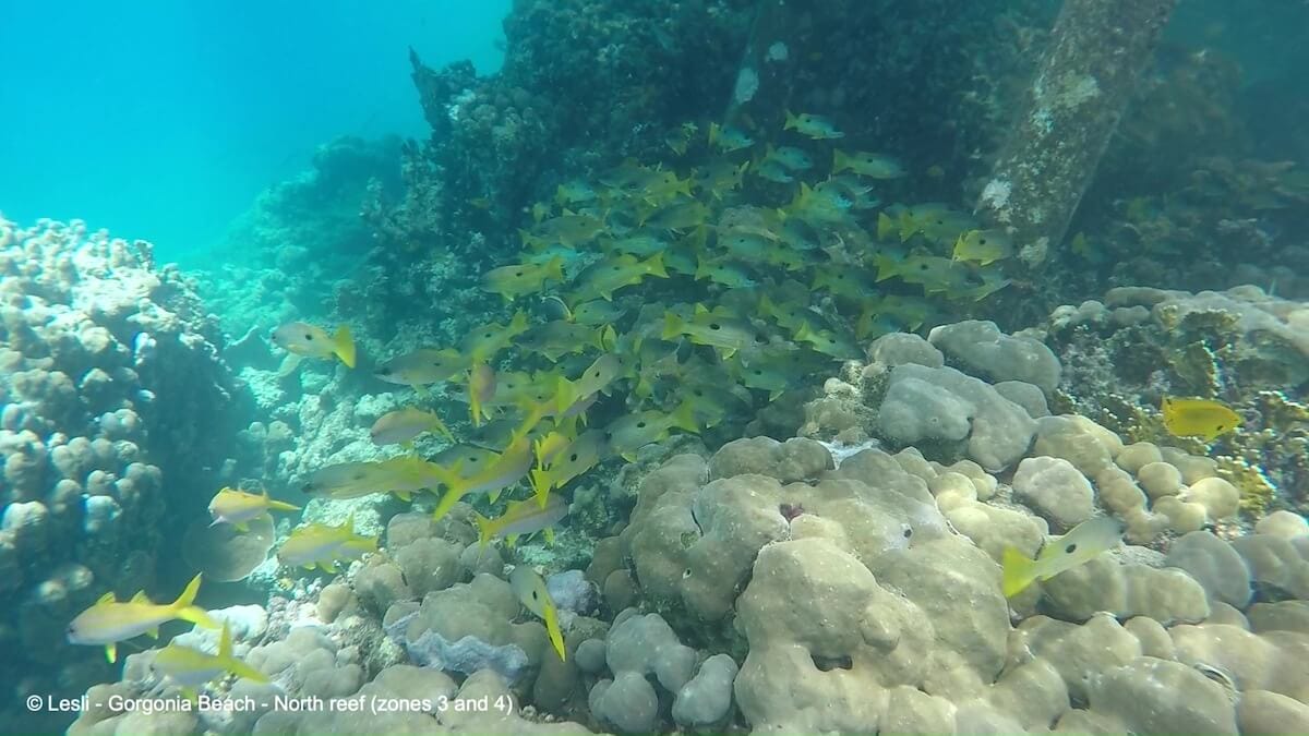 The main Gorgonia Beach snorkeling area is located at the end of the pontoon (zone 3 on the map above). Once in the water, swim along the reef drop off, which extends all along the coast, on both sides of the pontoon. Be careful not to let you caught by the current, if strong.