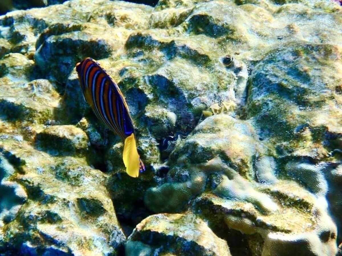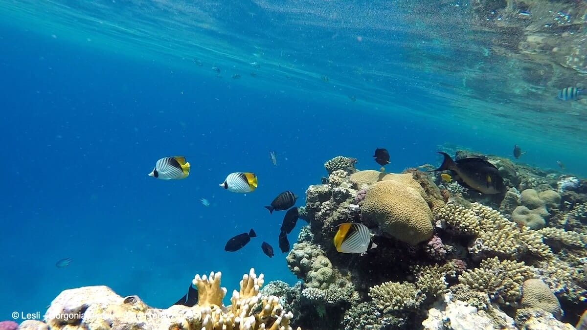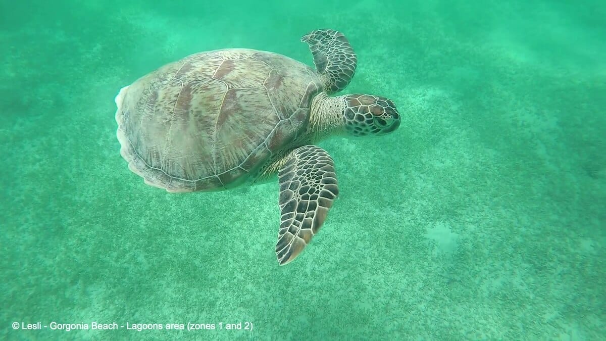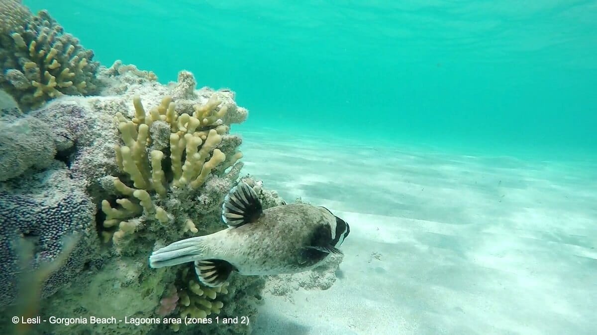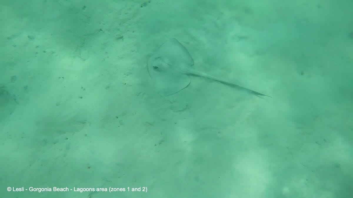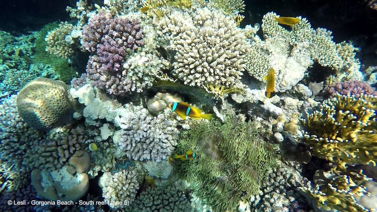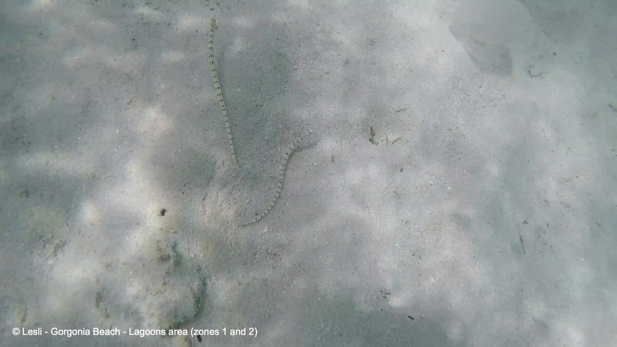 The main Gorgonia Beach snorkeling area is located at the end of the pontoon (zone 3 on the map above). Once in the water, swim along the reef drop off, which extends all along the coast, on both sides of the pontoon. Be careful not to let you caught by the current, if strong.