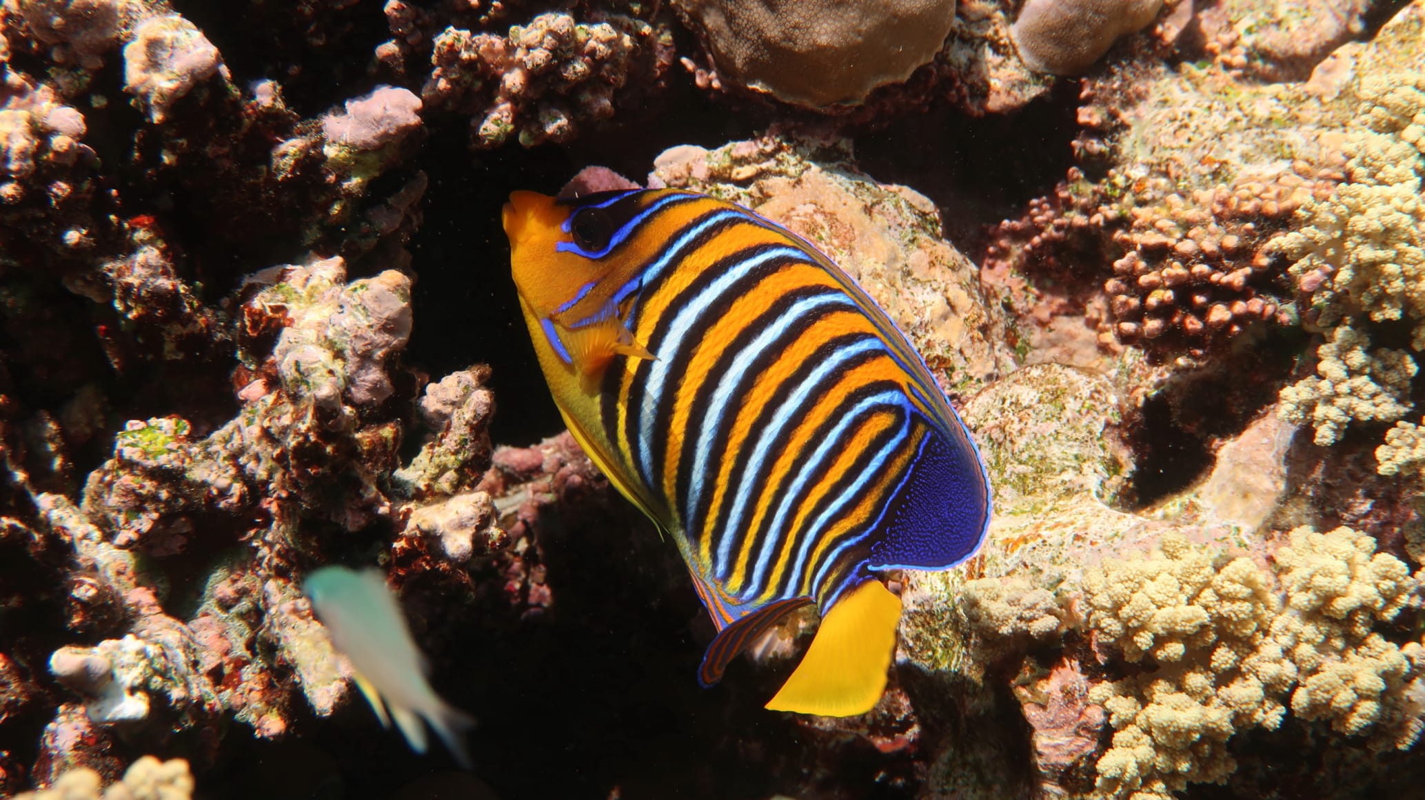 The reef flat (↕2ft/0,5m) is the kingdom of sulphur damsel, Klunzinger’s wrasse, bird wrasse, and regal angelfish, one of the most beautiful fish found in the Red Sea.