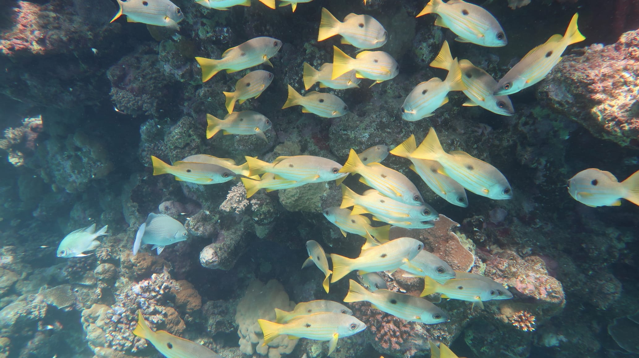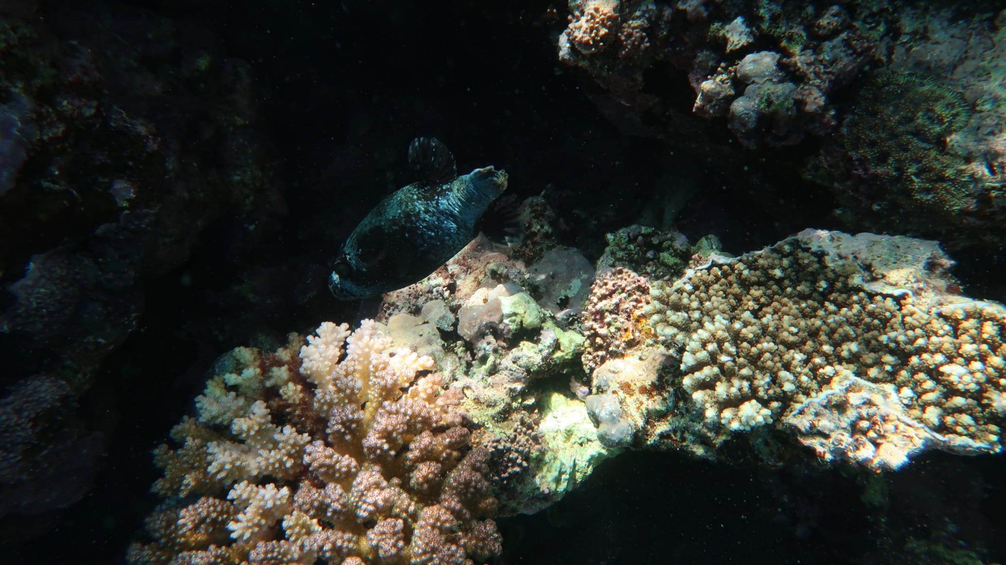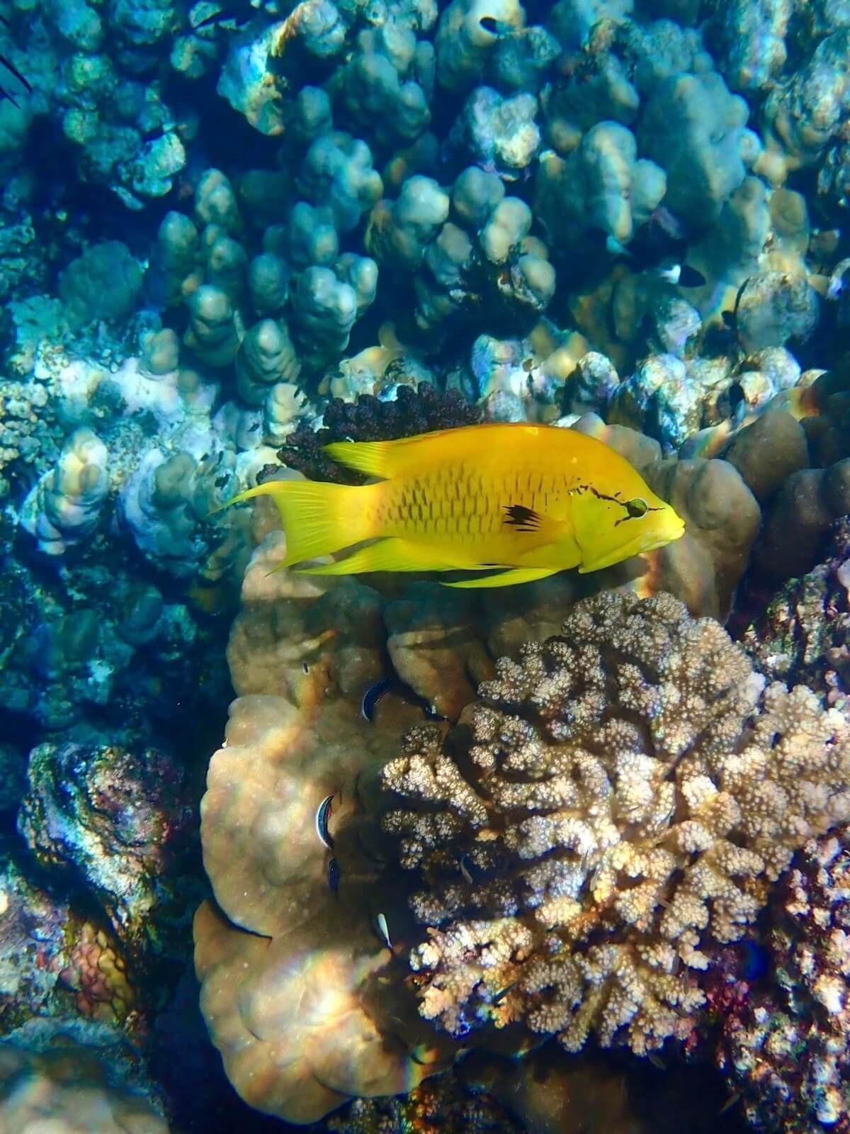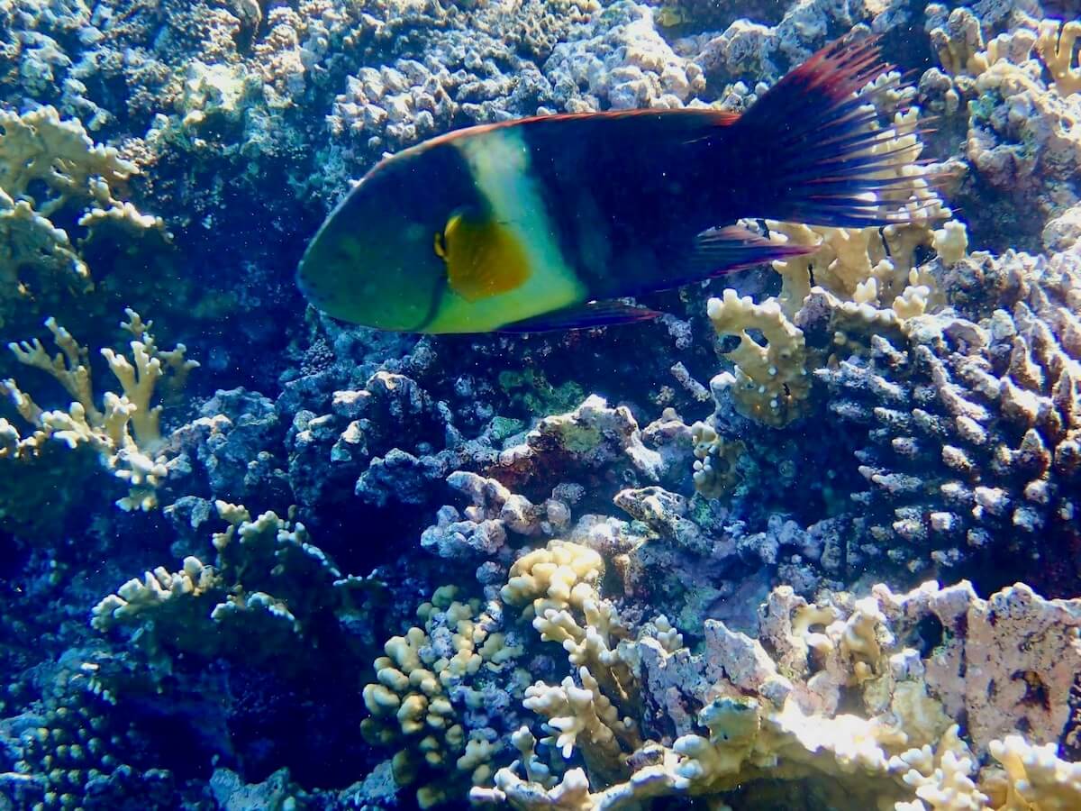 In the deeper areas (↕3-10ft/1-3m), bluecheek butterflyfish, bluespine unicornfish, Sohal surgeonfish and shoals of blackspot snappers are easily spotted. From time to time, a green sea turtle or hawksbill sea turtle also comes to the reef.