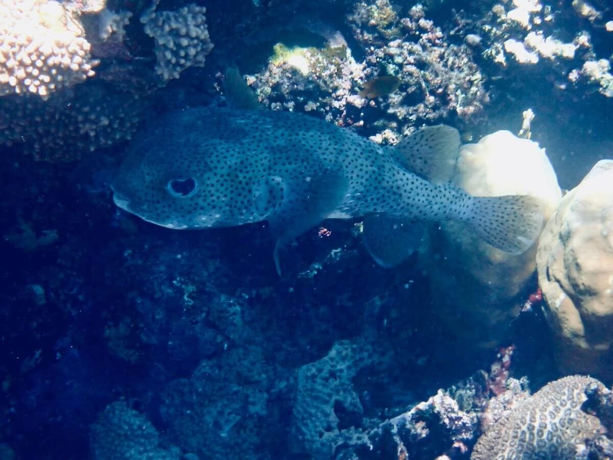 You can drift snorkel along to the “blue hole” (see map) which is an interesting spot with orbicular batfish, spotbase burrfish. Always have a look to the deep blue as you may see bluefin trevally, titan triggerfish, turtles or larger species.