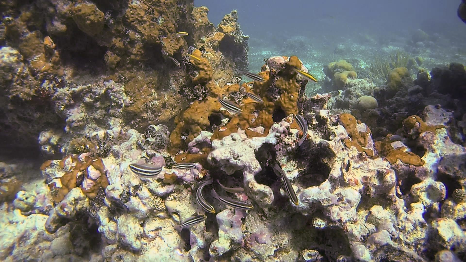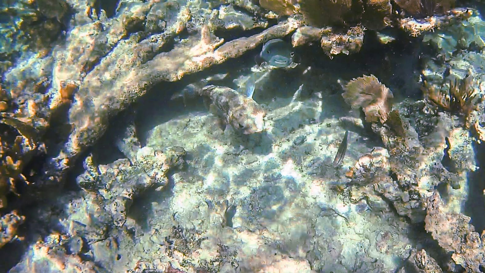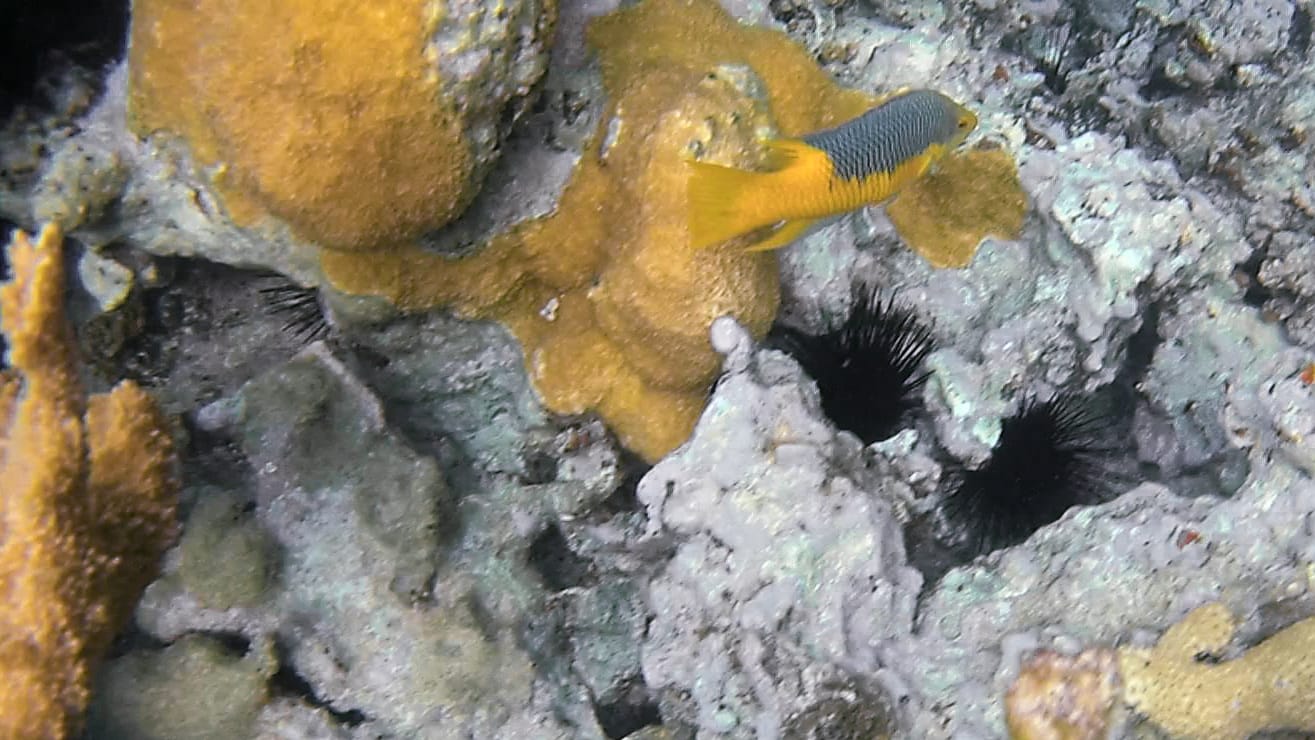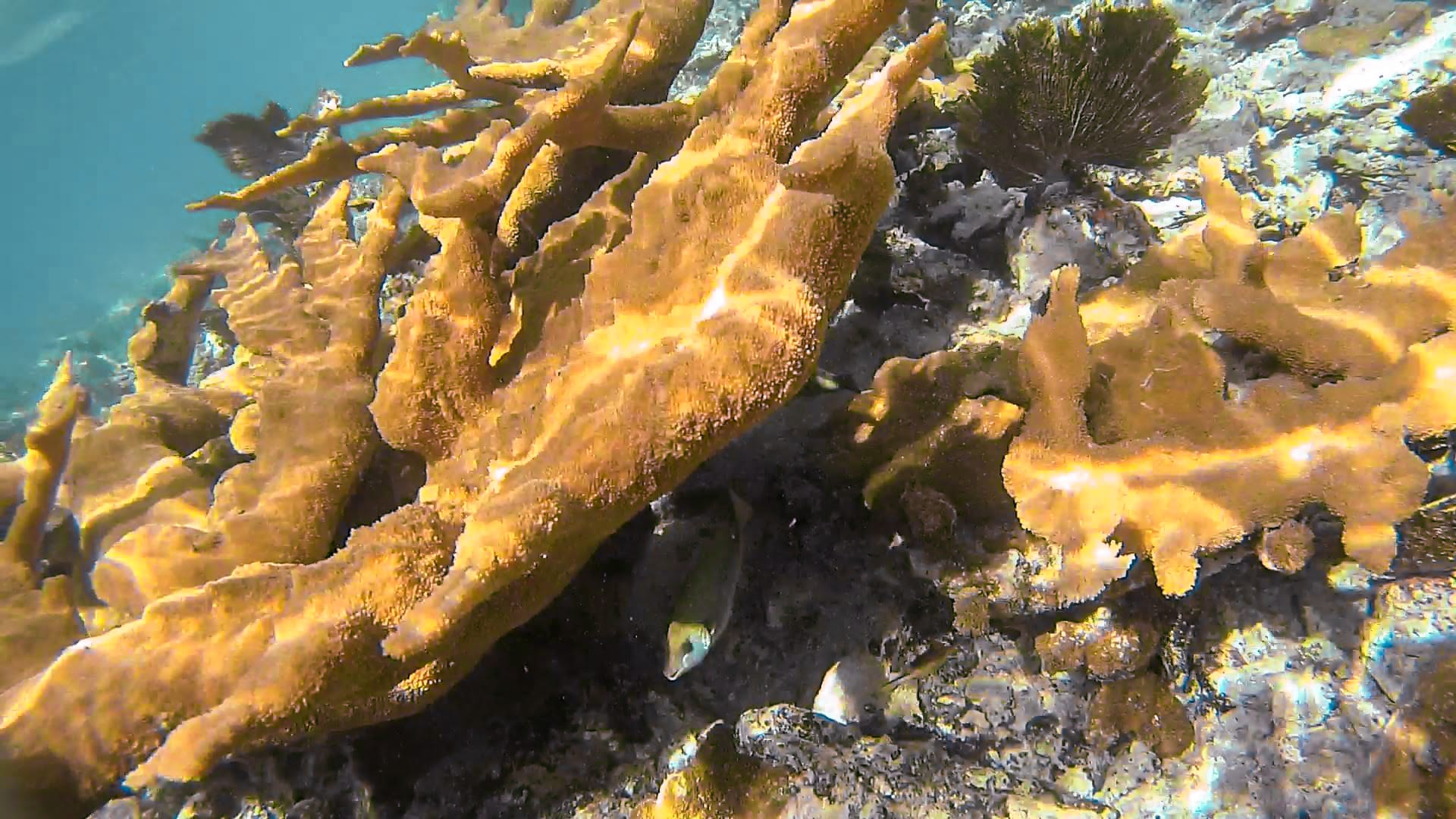 The reef is made of hard coral, especially elkhorn coral and fire coral, but you’ll also find gorgonian and sea fans in some areas. The reef is quite healthy, but the coral is broken corals in some places. Beware of the many sea urchins living between the rocks.