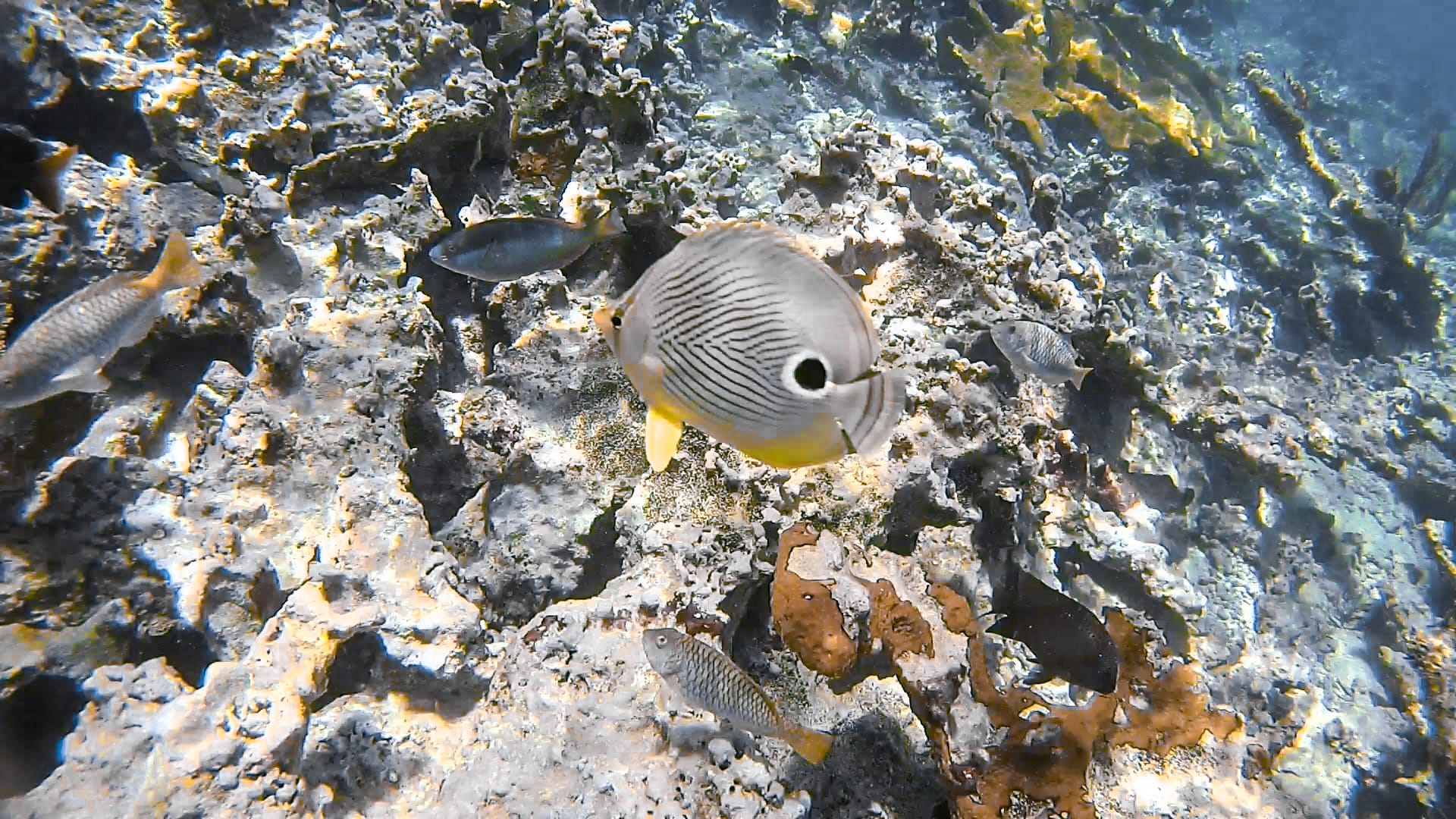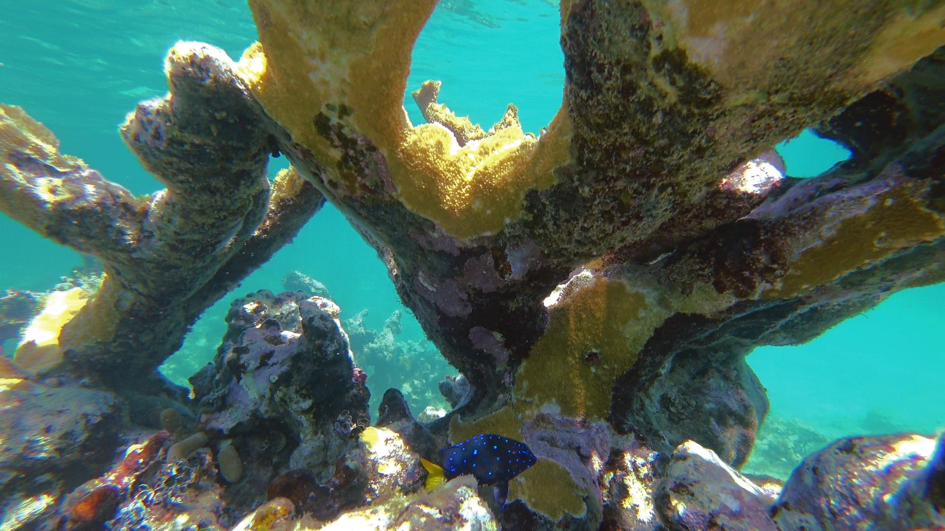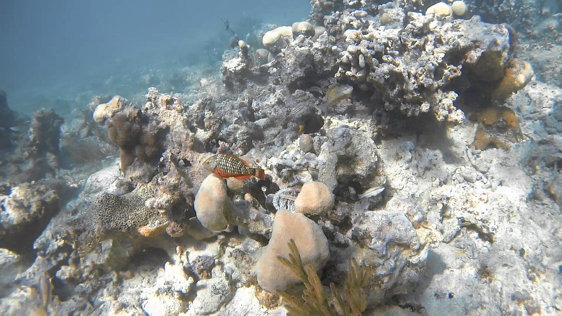 The reef is made of hard coral, especially elkhorn coral and fire coral, but you’ll also find gorgonian and sea fans in some areas. The reef is quite healthy, but the coral is broken corals in some places. Beware of the many sea urchins living between the rocks.
