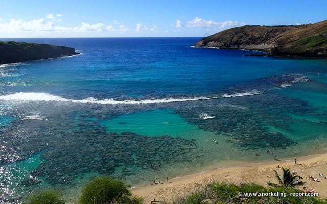With its calm and protected turquoise waters, only a few minutes from the road for Honolulu, Hanauma Bay is the main snorkeling destination on the island of Oahu. Despite some drawbacks –among which are entrance fees and large visitor numbers– the lagoon, nestling in an ancient volcano crater, is ideal for beginners, who can observe diverse underwater life in good safety conditions.