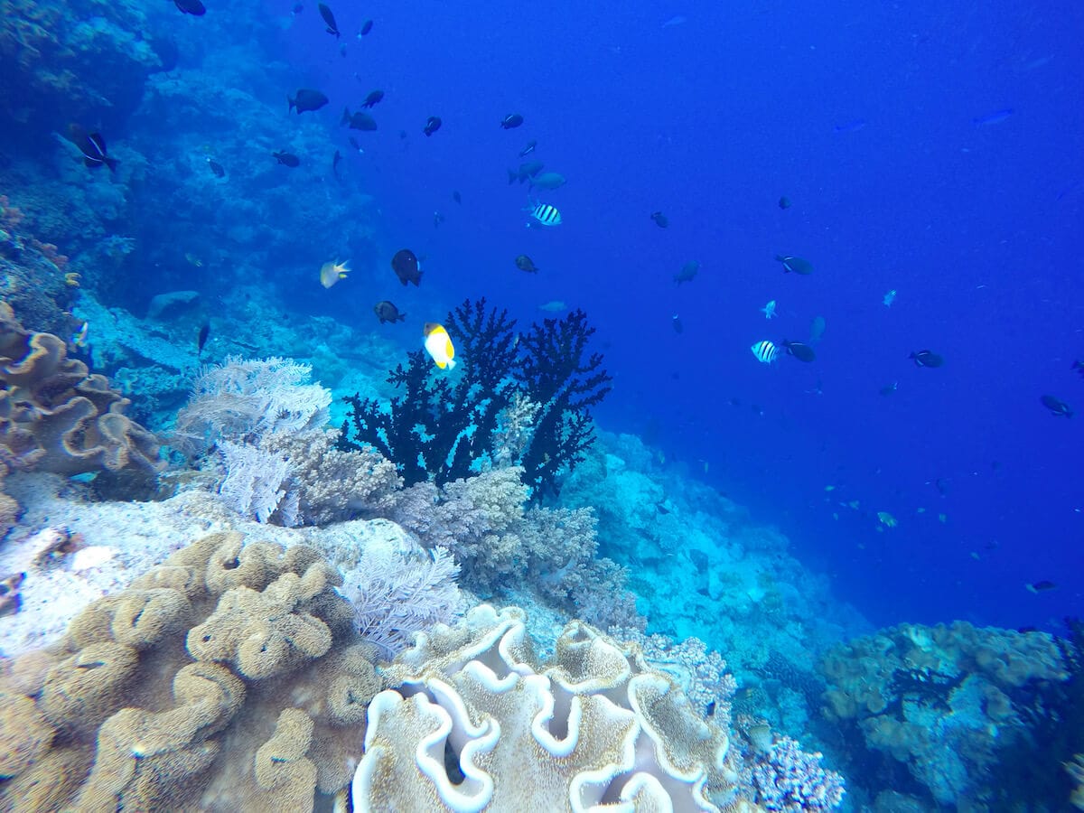 We recommend entering the water from the beach, near the village. It is indeed at this location that the reef is the narrowest, and therefore that accessing the drop-off is the easiest.