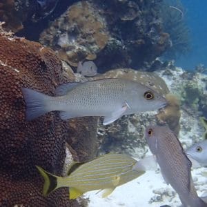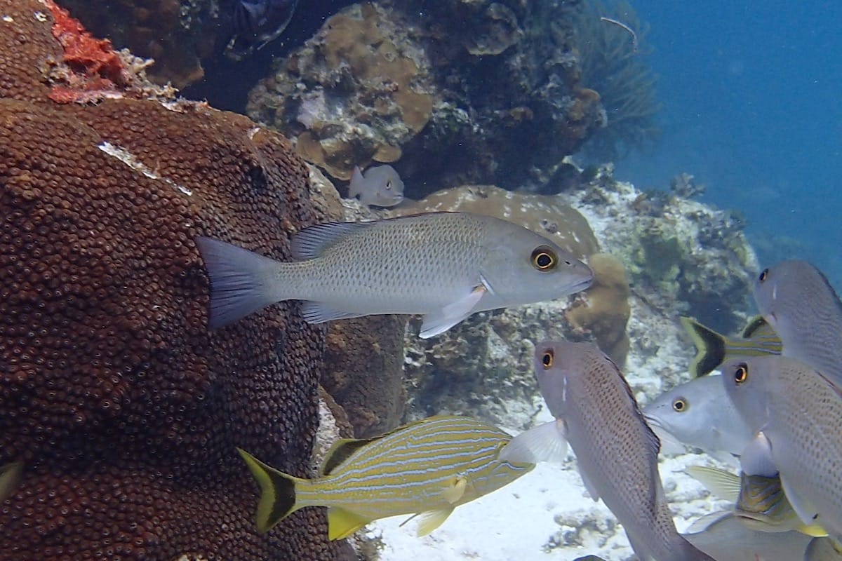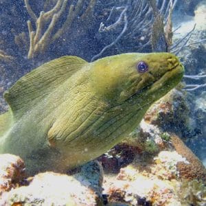 This spot is made up of a relatively deep pass (↕20-25ft/6-8m), cut in a shallower coral reef (↕3-10ft/1-3m). The area around the pass is the most spectacular. The reef overlooks sandy areas where stingrays and nurse sharks swim. Along the reef drop-off, it is not unusual to encounter large green moray eels, which are used to being fed by divers. Horse-eyed jacks shoal by hundreds in the pass.