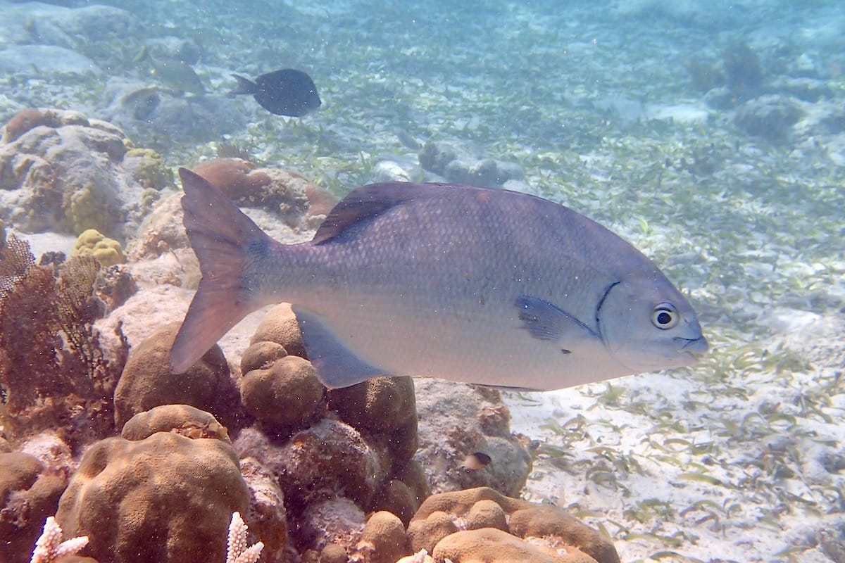 Among the most colorful fish you may spot at reef are, among dozens of other species, blue tang, Spanish hogfish and the iconic French angelfish. Green sea turtles frequently visit the seagrass beds around the mooring area (↕6-10ft/2-3m). This is also the place where you will have the best chance of seeing a stingray or a visiting spotted eagle ray.