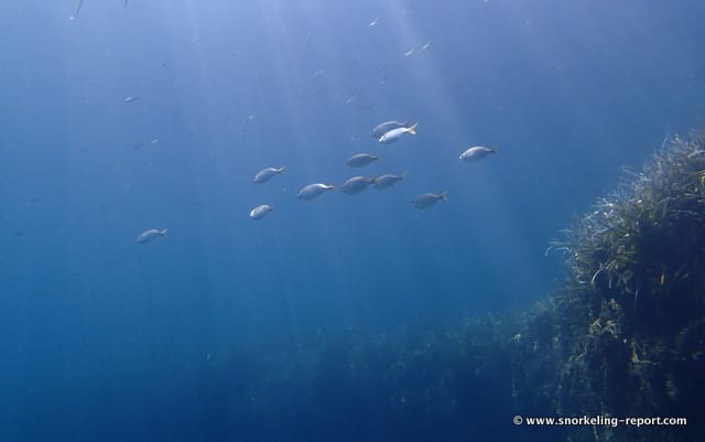 Schools of salema porgy swim over the meadows and you can see small groups of seabream dashing between the rocks. While colorful, wrasse are brisk and particularly hard to shoot if you are taking pictures.