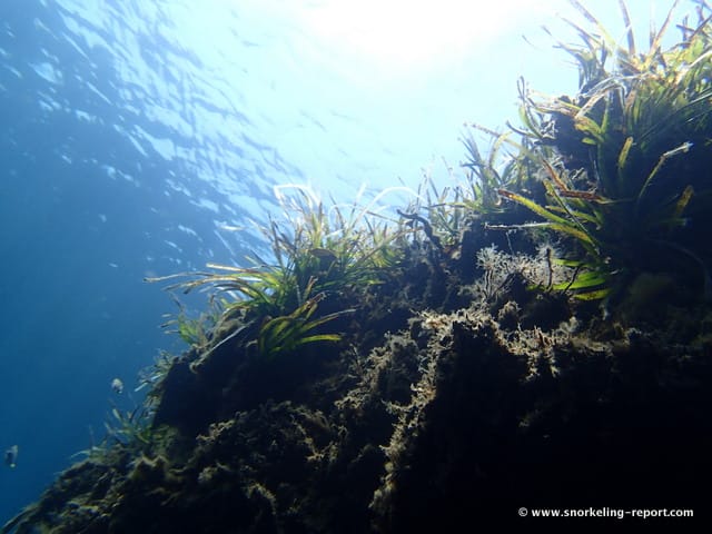 If you want to venture into deeper areas where you are likely to see more fish, swim away from the island on its right side. Water depth increases there (↕6-18ft/2-6m) and the seabed becomes gorgeous with its white sand, green Posidonia and rays of light dancing on rocks.
