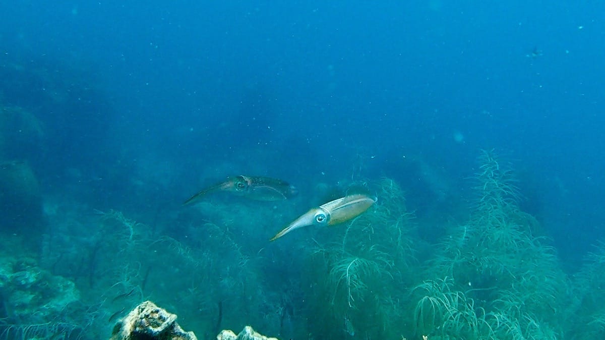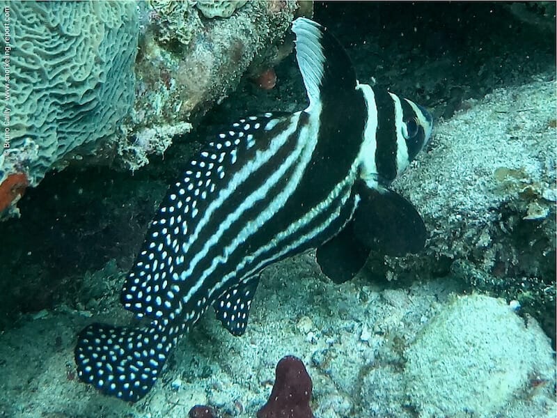 30-40m from shore, deeper reef areas (↕3-5m), covered with corals, sea fans, sponges and Sabella, can be snorkeled. The reef is home to a great diversity of fish, such as the bluehead wrasse, the spotted drum and the harlequin bass. Reef squids are also common on this spot.