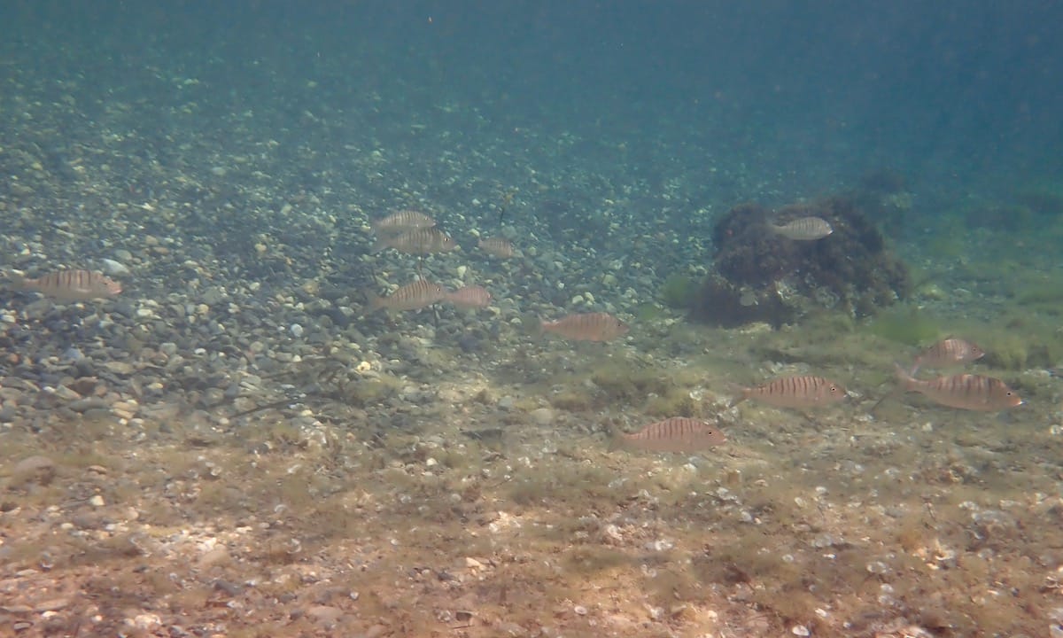 In the center of the cove, you’ll find deeper seagrass beds (↕6-12ft/2-4m) where sand steenbras and European seabass are pretty common. The rocky drop-offs that border the islets (↕10-25ft/3-8m) are also a nice area to explore, where gilt-head bream, sargo and damselfish are easy to spot.