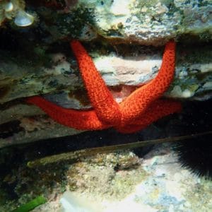 This spot offers an interesting diversity of marine ecosystems. Near the beach, you’ll snorkel shallow Cymodocea and Posidonia meadows (↕2-6ft/0.5-2m). Red starfish, brown wrasse, rainbow wrasse and broadnosed pipefish, a species of pipefish that perfectly mimics the shape of a Posidonia leaf, can be found in the meadows.
