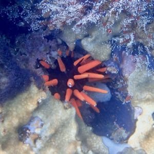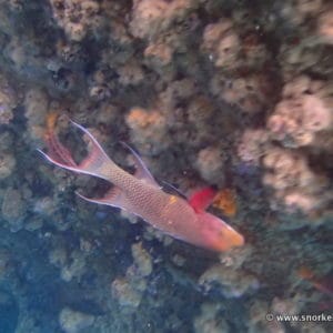 In the cracks, you will also spot pencil urchins, starfish, and purple sea anemones. Among the fish species frequently seen at Kicker Rock are the coral hawkfish and the giant hawkfish, the Mexican hogfish, and the razor surgeonfish.