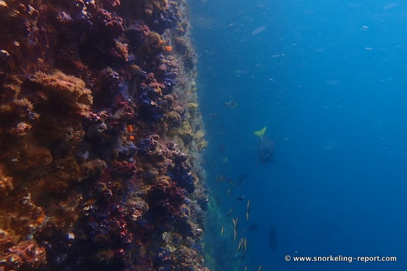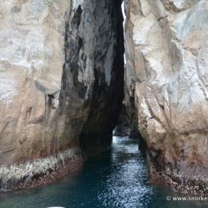 When the seas are calm, you can venture into a few-meter-wide channel (↕6m/20ft) through the rock, and even swim out to the other side. Visibility on this site varies a lot depending on currents and sea conditions.