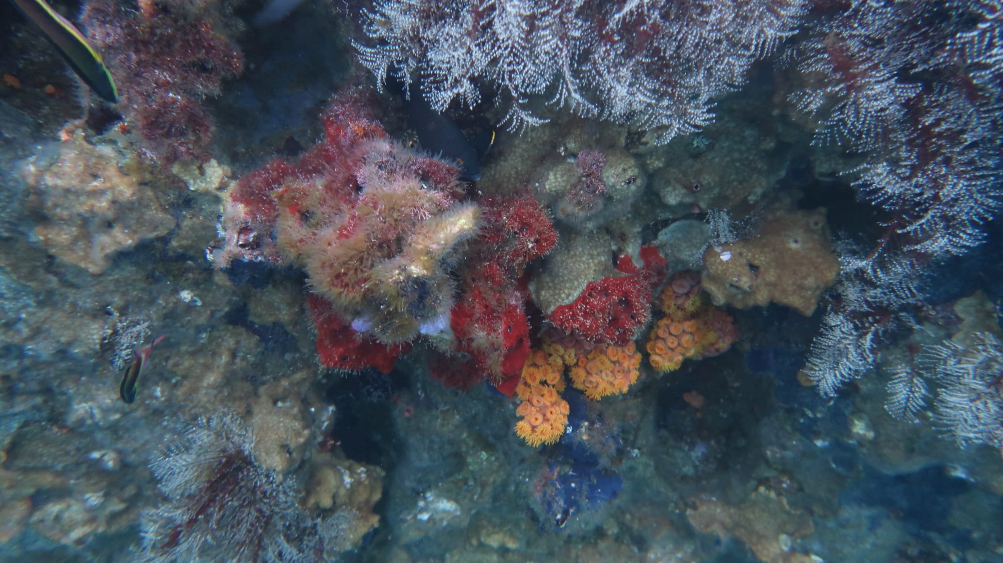Stay close to the rocks. While snorkeling along them, you will notice colorful corals, sponges, and gorgonians encrusted on the walls (↕0-2m/0-6ft).