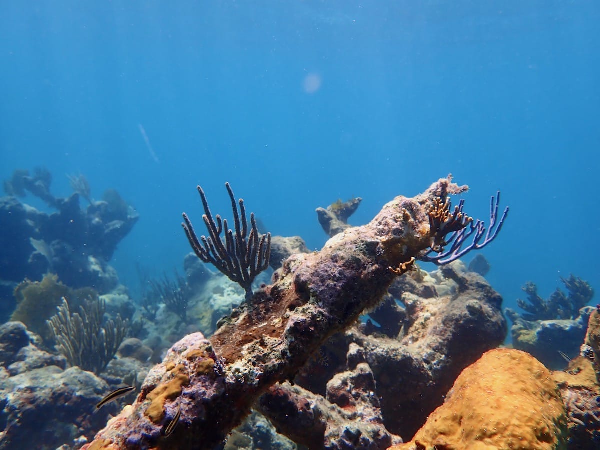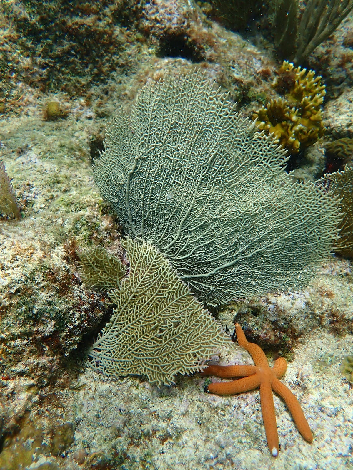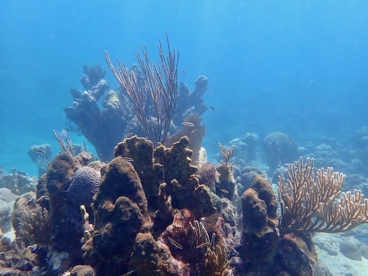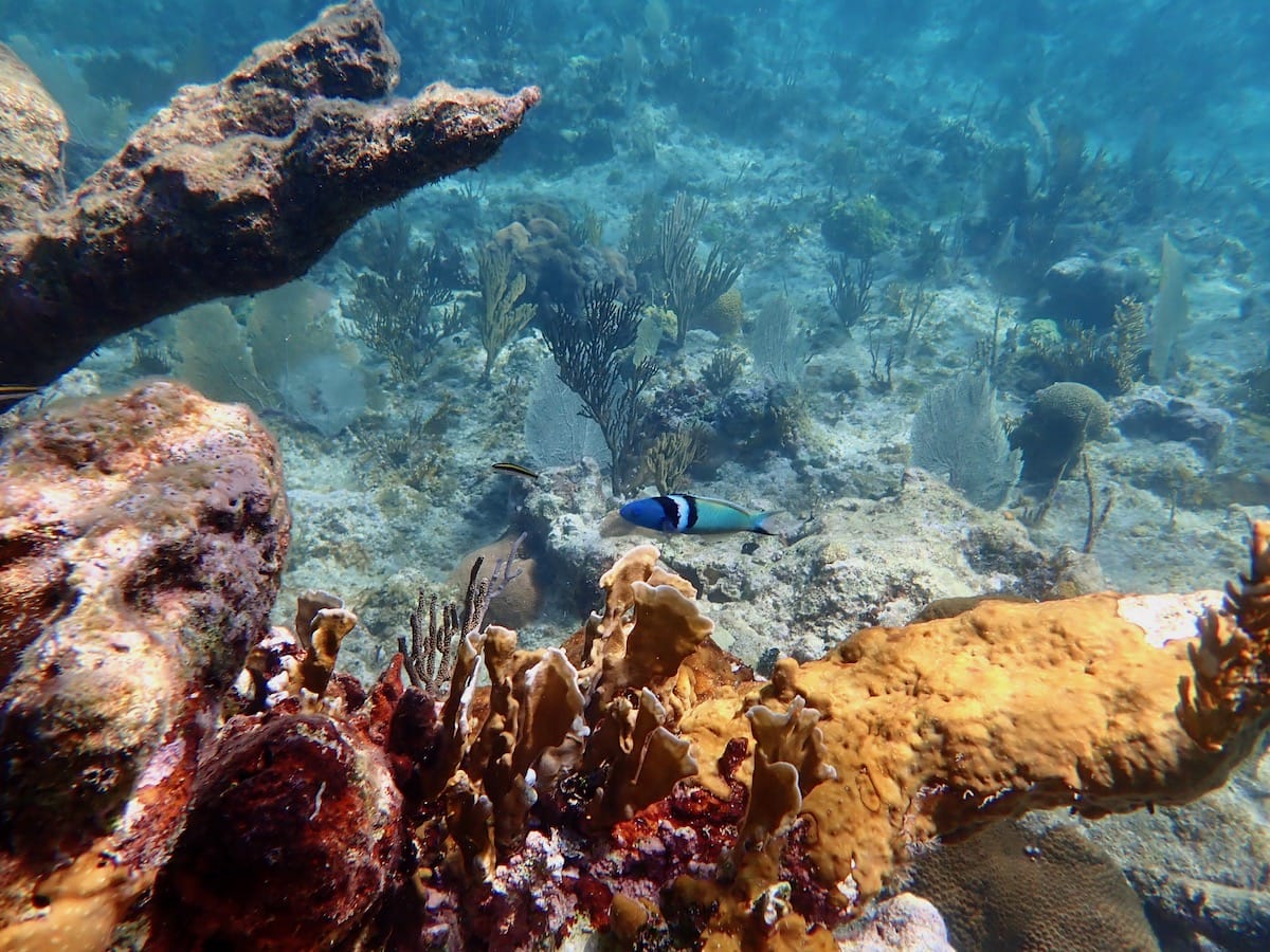 Corals also dwell here, in varying degrees of health. Sea ginger, blade fire coral (Millepora complanata), brain coral and a few, rather damaged clumps of elkhorn coral can notably be observed in both spots.