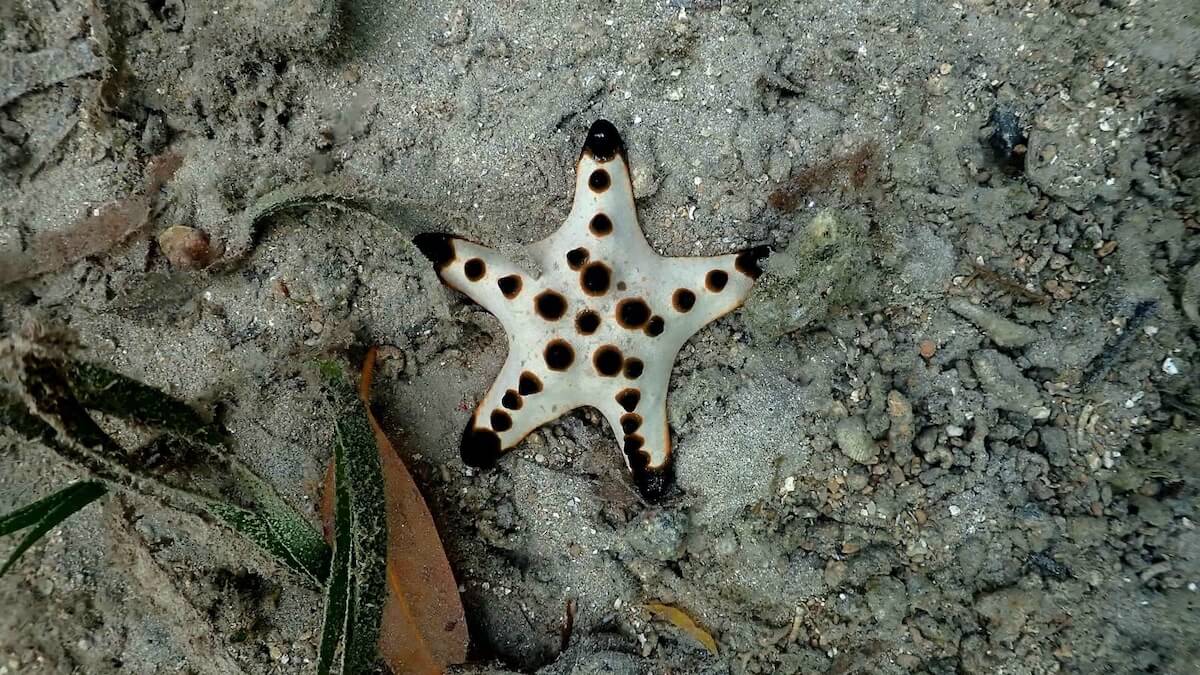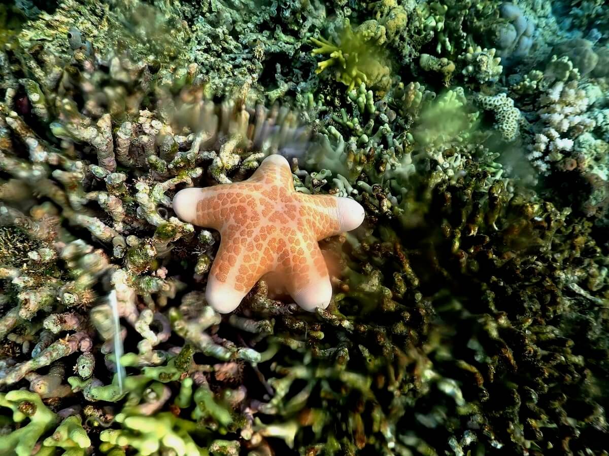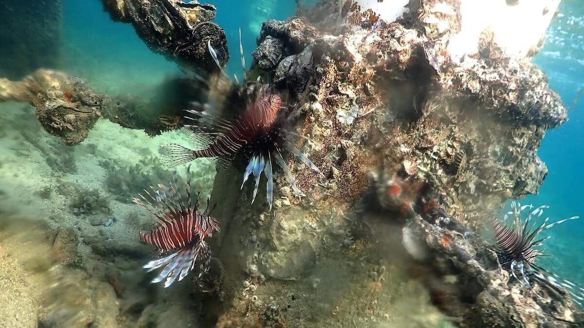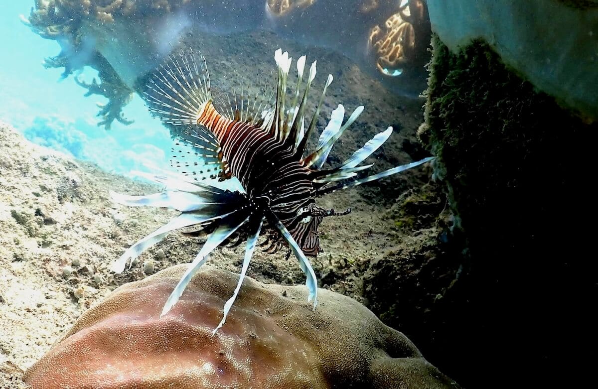 Lionfish gather in numbers around the jetties’ structures, while large starfish of several species (see list at the bottom of the page) lie on the bottom. If you have a keen eye, you may spot small Thor amboinensis shrimps in the anemones or corals.