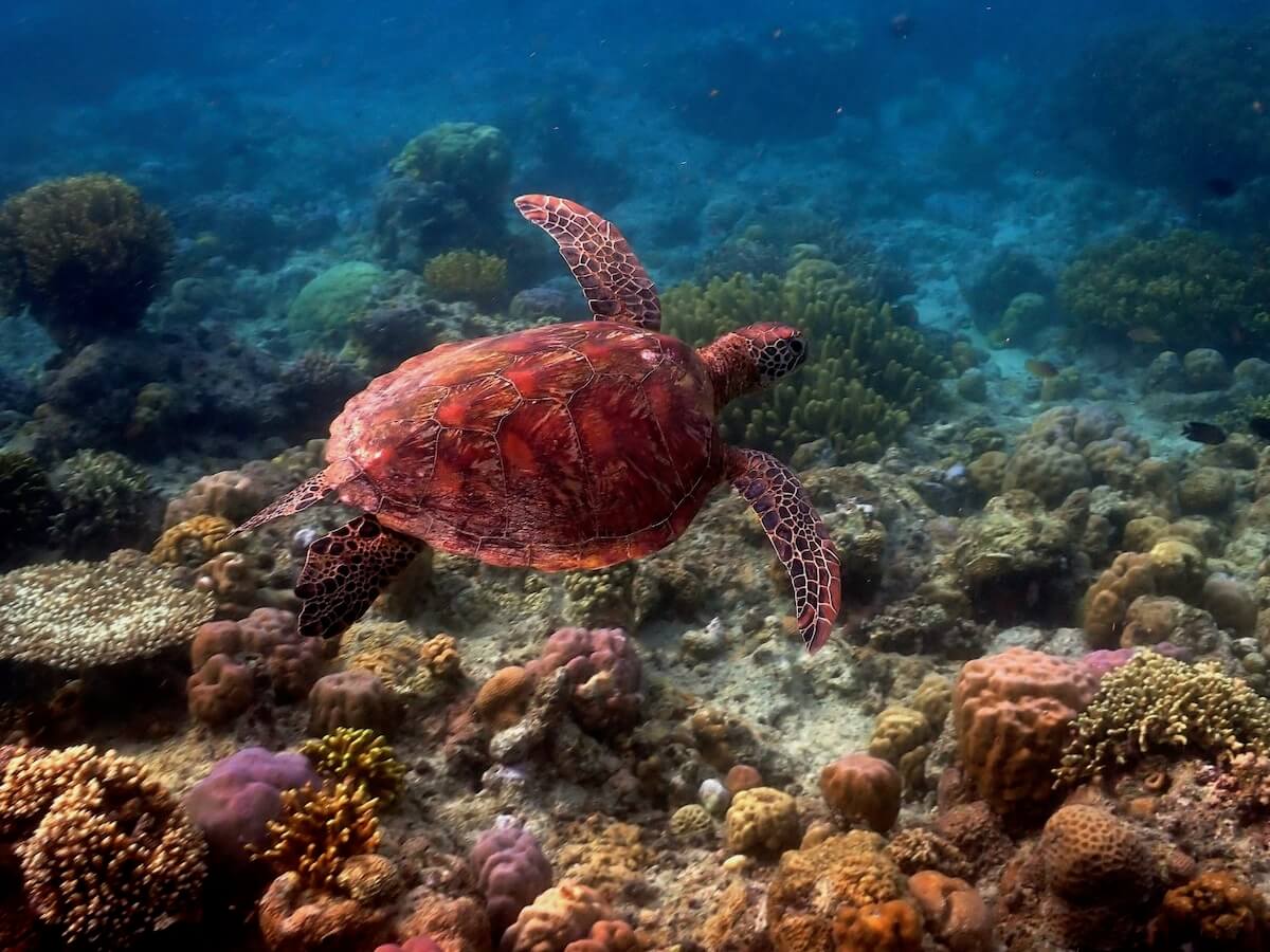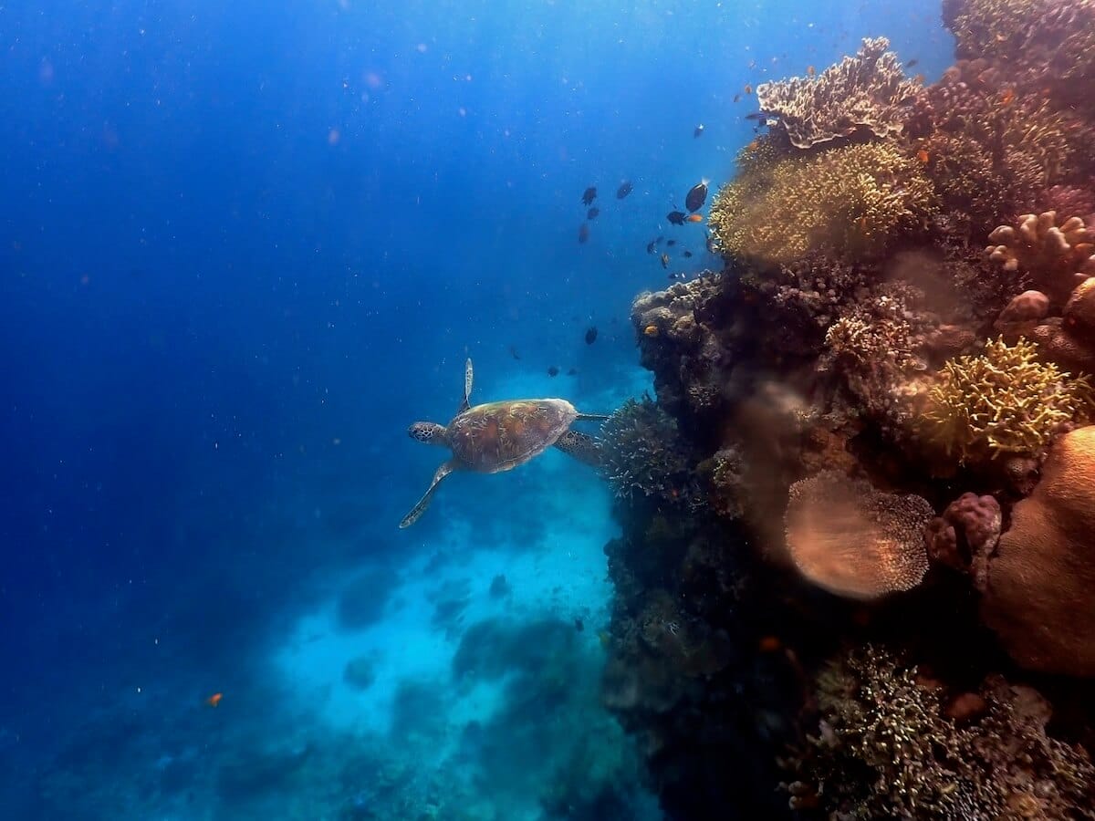 The reef slopes are richer in colorful fish, attracting a dozen different butterflyfish, triggerfish and schools of damselfish. Small green turtles are not uncommon in this area.