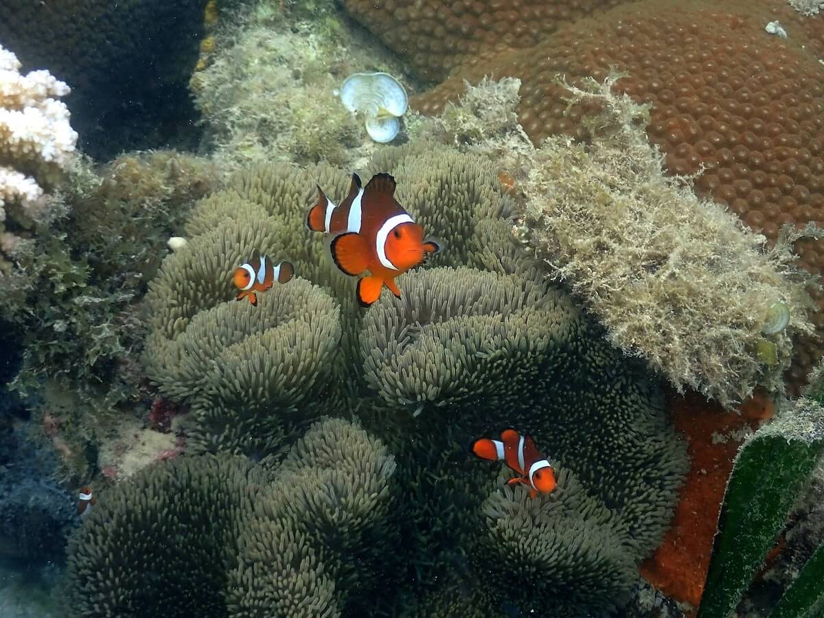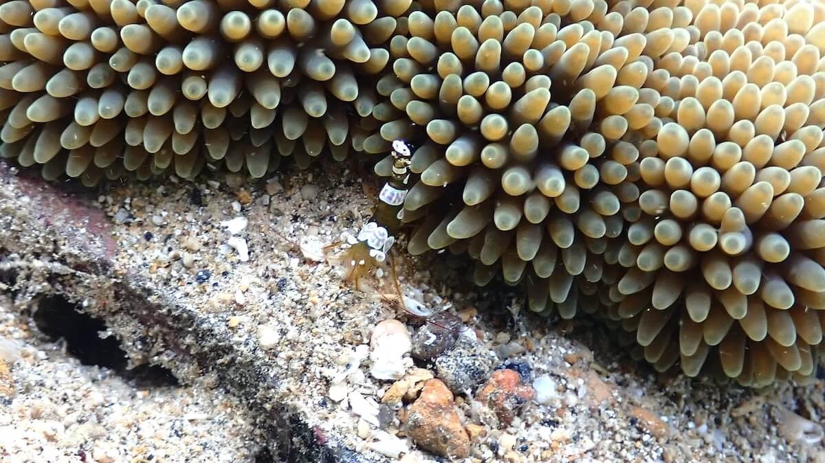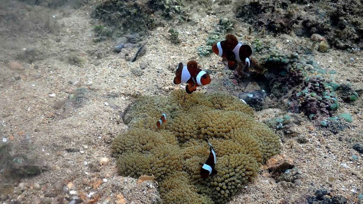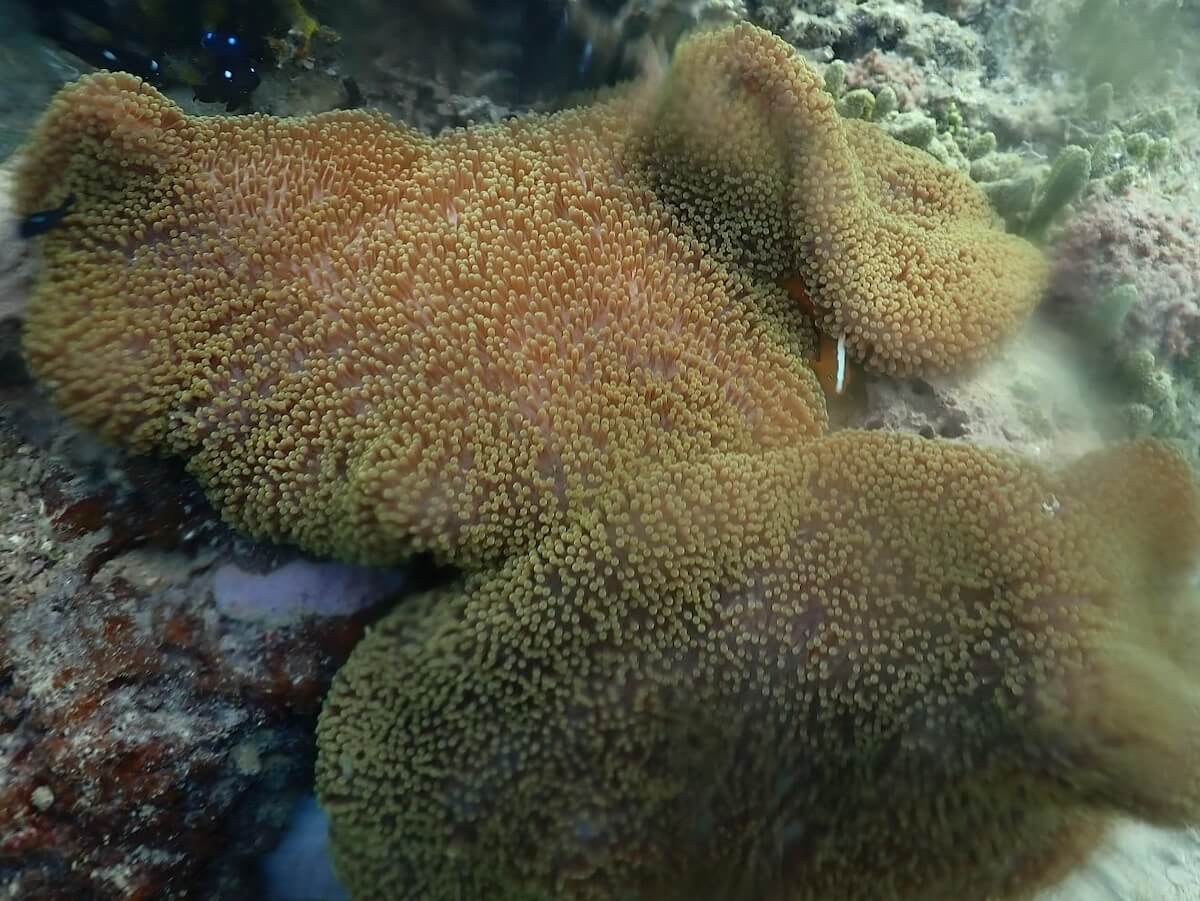 Mertens’ anemones, with their very short tentacles, can be seen in the sand or the seagrass beds. These are usually inhabited by communities of Ocellaris clownfish or Orange-skunk clownfish.